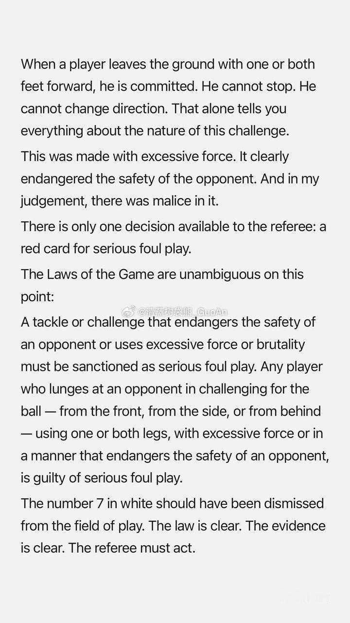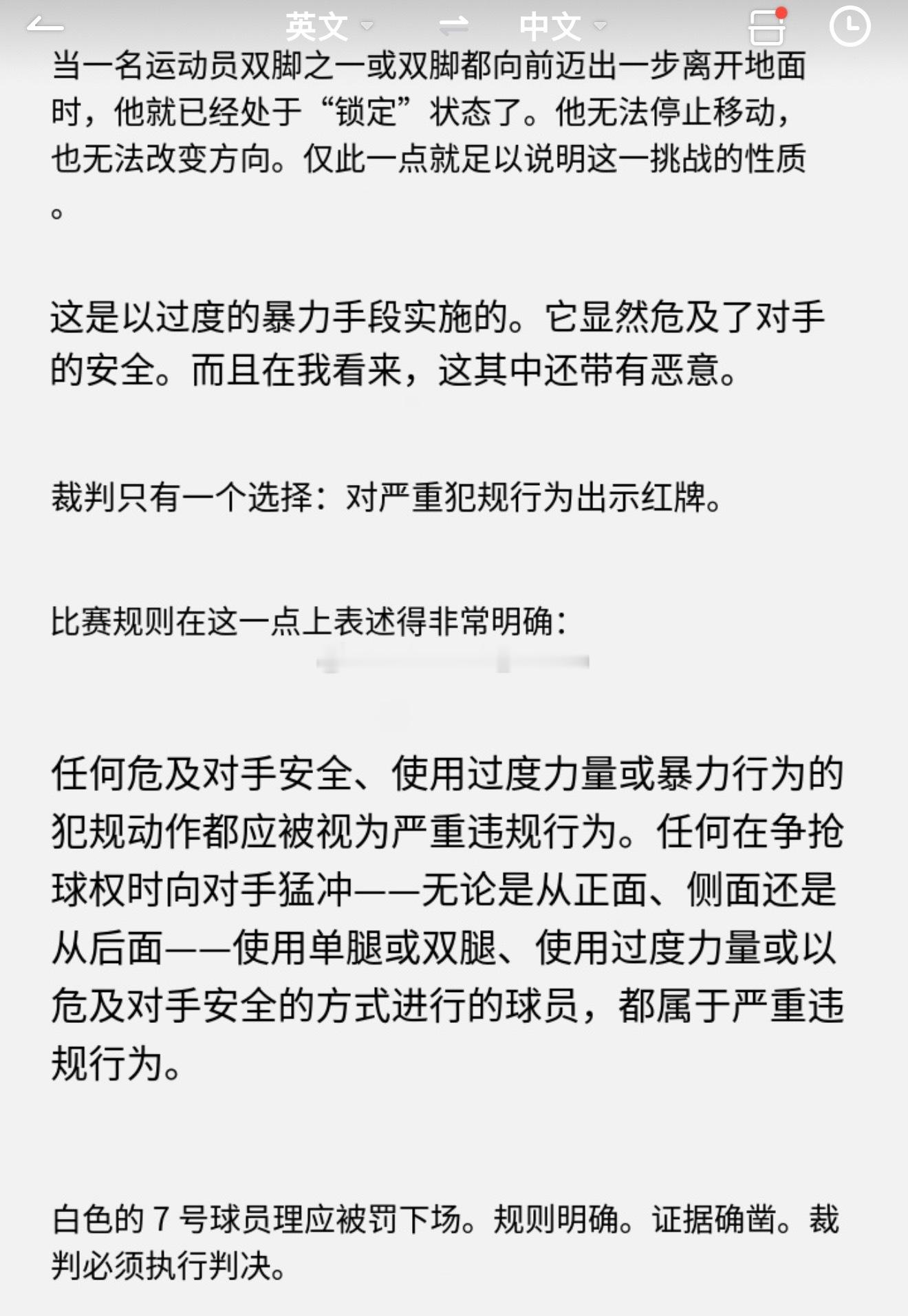 ▫️韦世豪飞铲恩科洛洛:这是一次以过度力量实施的犯规,危及了对手的安全,其中还带有恶意。裁判员只有一个选择:对严重犯规出示红牌。(图一为英文原文,图二为参考机翻)