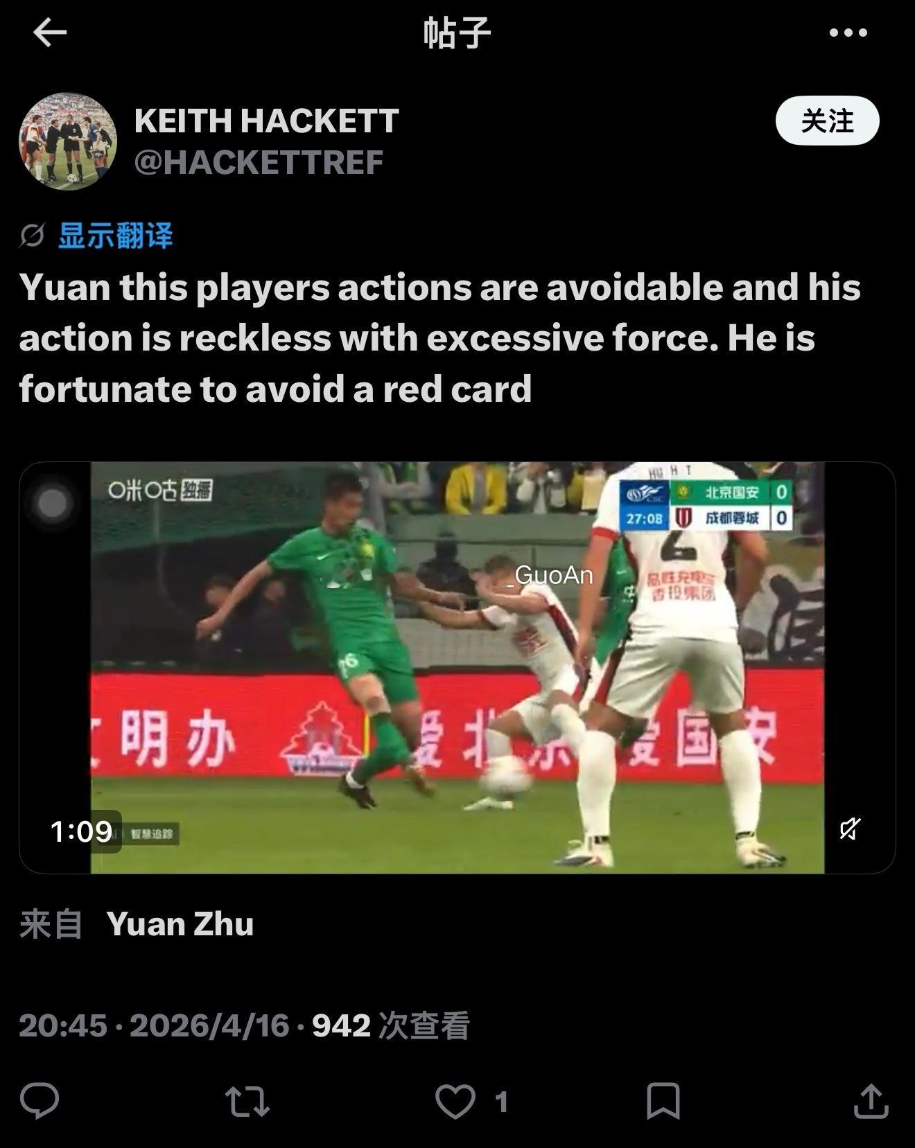 有网友向英国退休裁判Keith Hackett咨询北京国安VS成都蓉城一战中的几