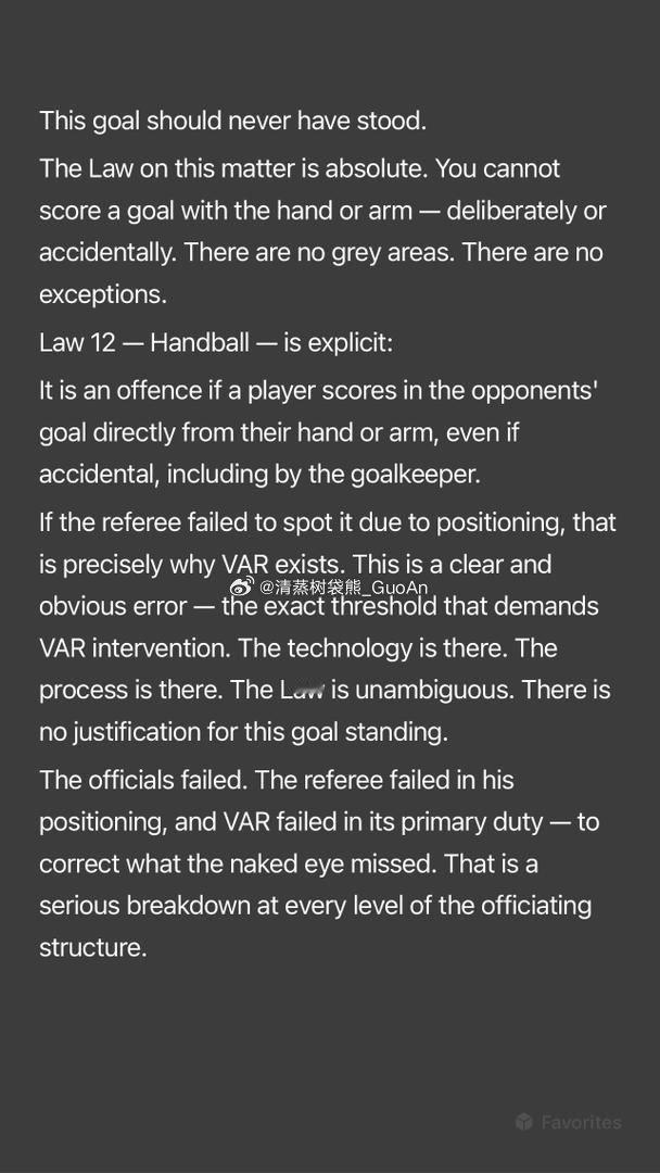 ▫️廖力生手球进球:主裁判在场上因为站位原因未能看到,而VAR也未能履行其职责——即纠正肉眼无法察觉的问题。(图三为英文,图四为参考机翻)