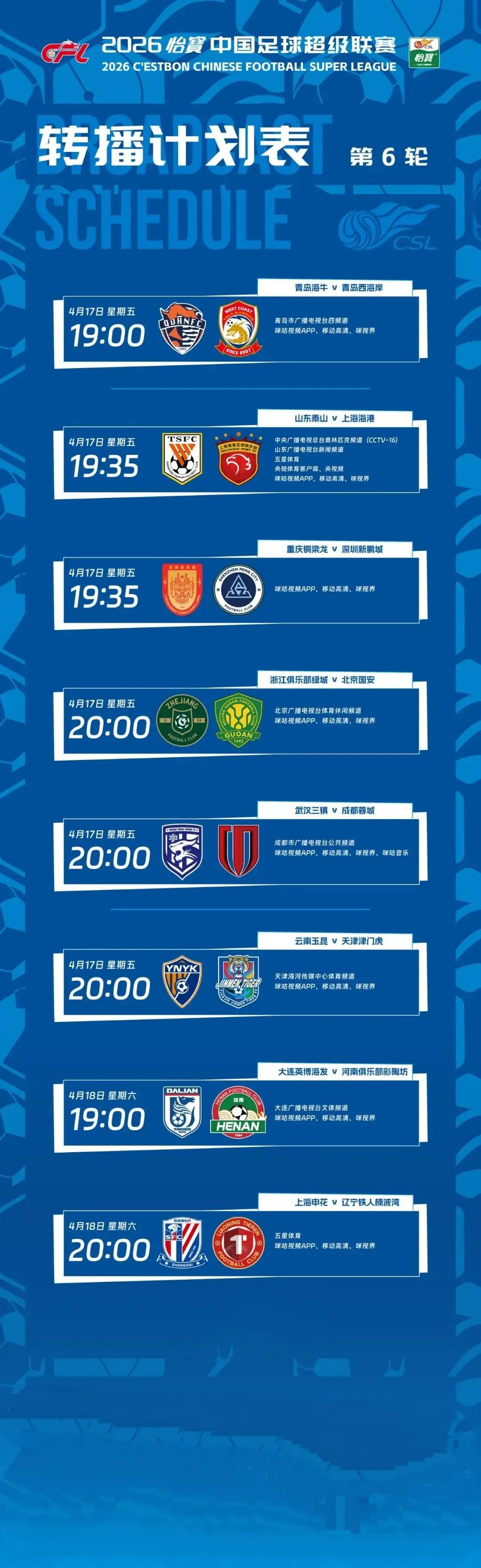 可能是已老糊涂,刚刚才发现中超第6轮比赛,竟只有2场安排在周六、有6场安排在周五