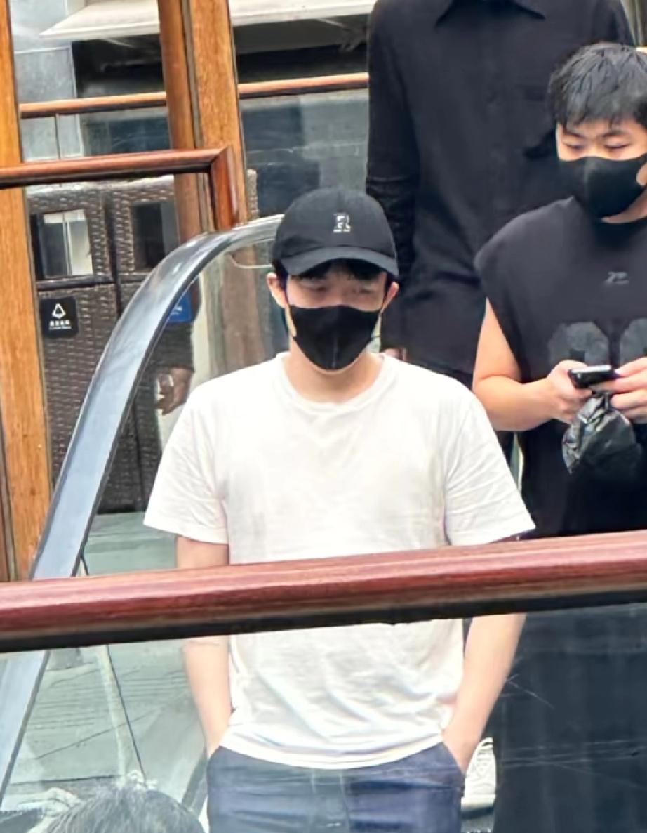 王楚钦身穿白色半袖和黑色短裤,戴着帽子和口罩,防止被大量粉丝认出。