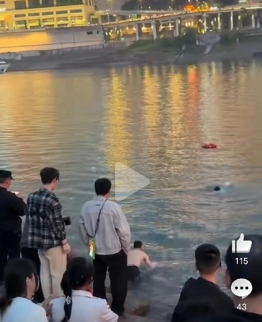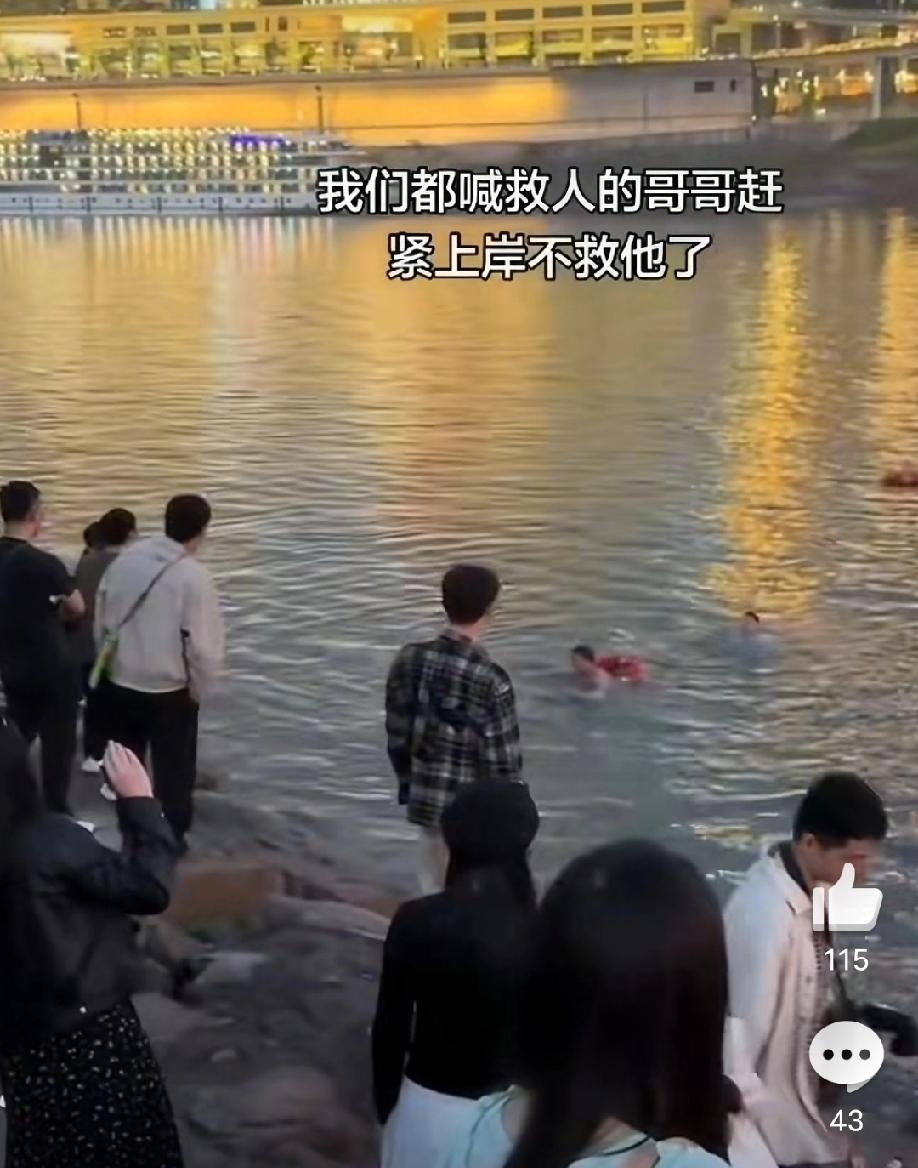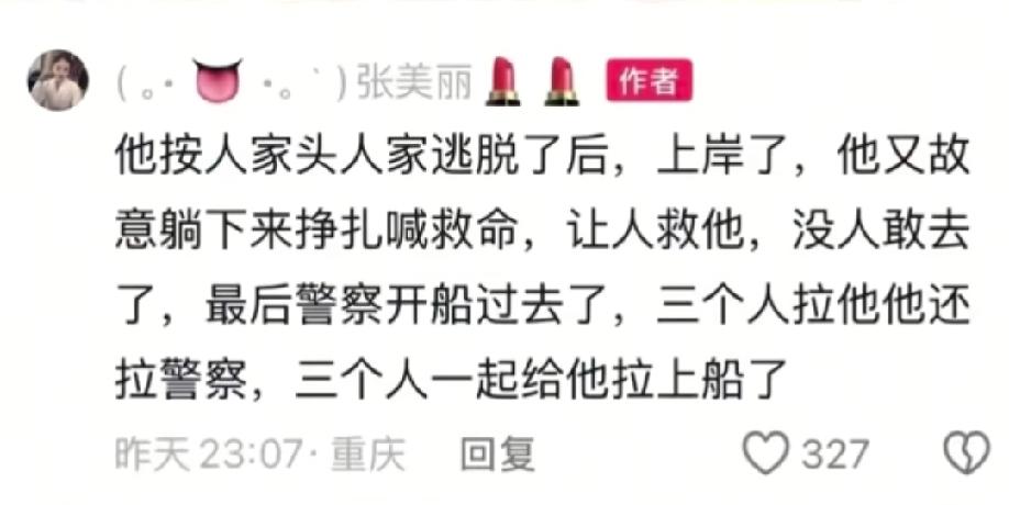 这下没人敢去了,最后警察开船过去了,三个人拉他,他还拉警察,最终三个人一起给他拉上了船……