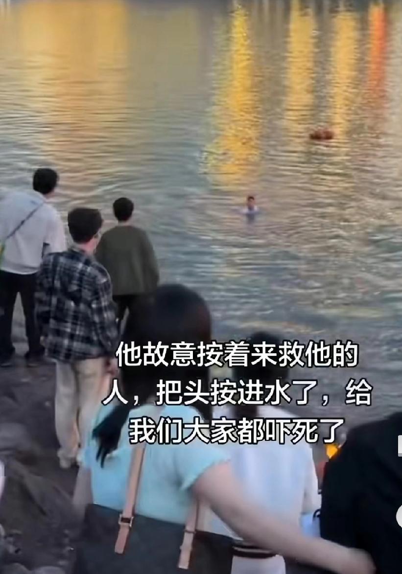 网上的一段视频,男子疑似轻生,别人救他,他按人家头,人家逃脱后上岸了,他又故意躺下来挣扎喊救命,让人救他……