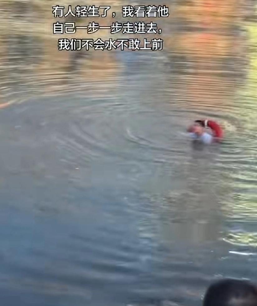 网上的一段视频,男子疑似轻生,别人救他,他按人家头,人家逃脱后上岸了,他又故意躺