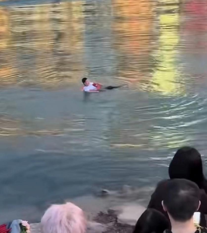 视频一开始,岸上有人扔了一个救生圈给到他,他也钻进了救生圈里面,可过了一会儿,救生圈跟他这个人又分开了,就有了热心人下水救他,他把热心人摁到水下的这一幕。