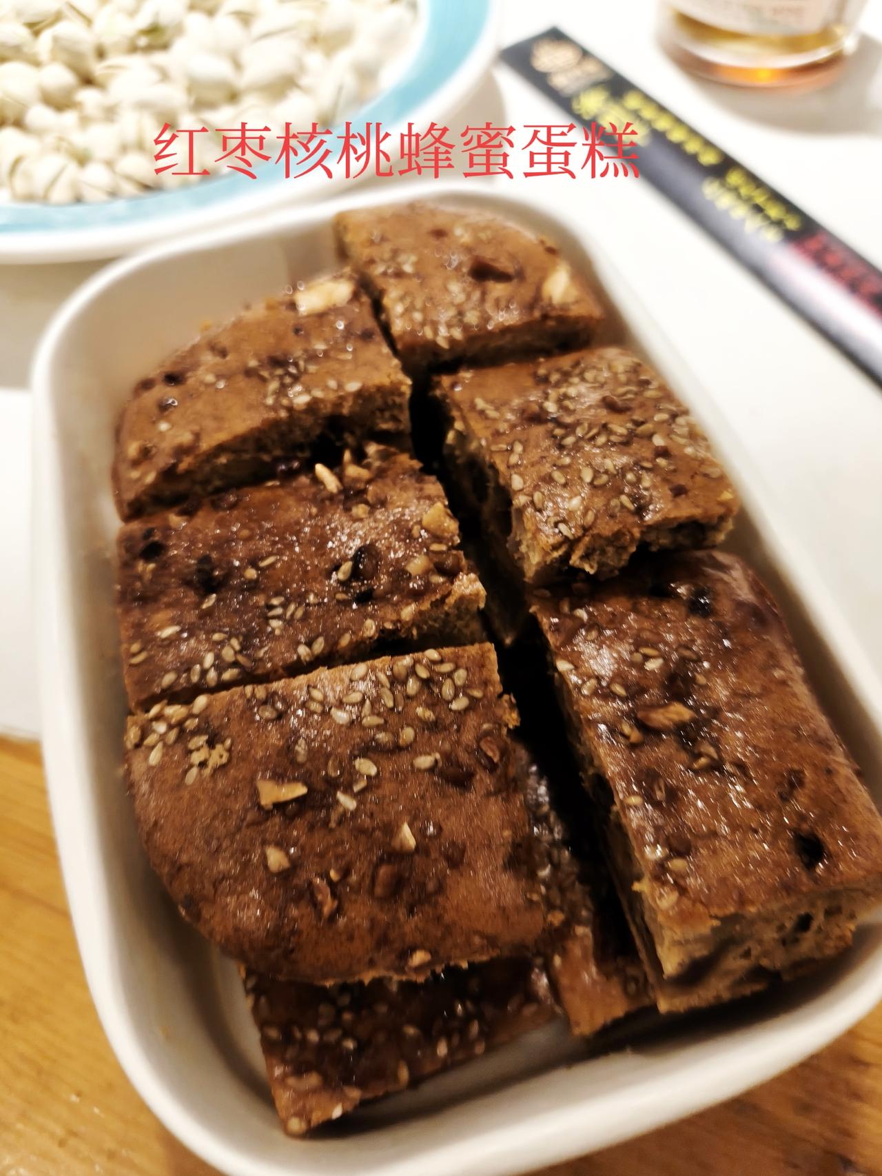 图2是红枣核桃糕,原料除了红枣核桃还有芝麻,加牛奶、黄油、鸡蛋、一点面粉和红糖、蜂蜜,我们小姐妹聚餐大家一尝都抢着吃。
