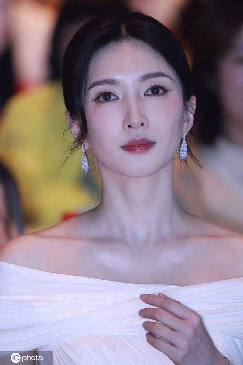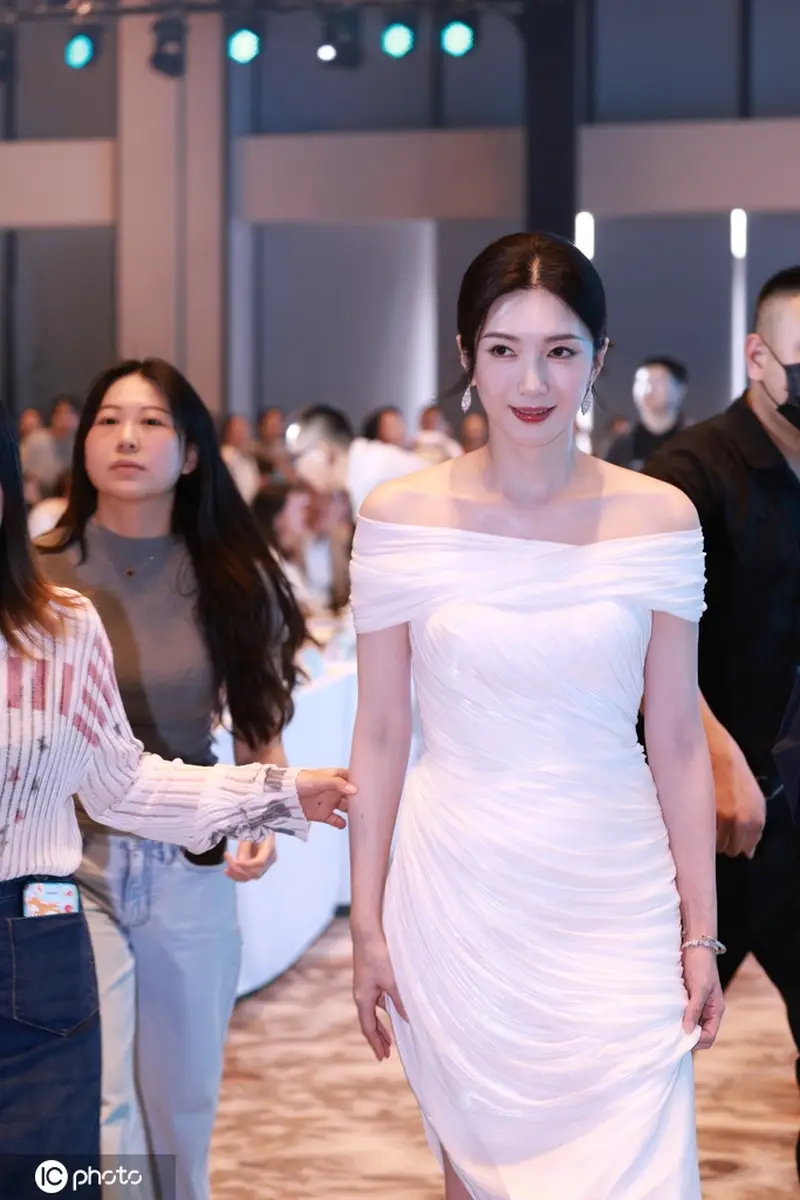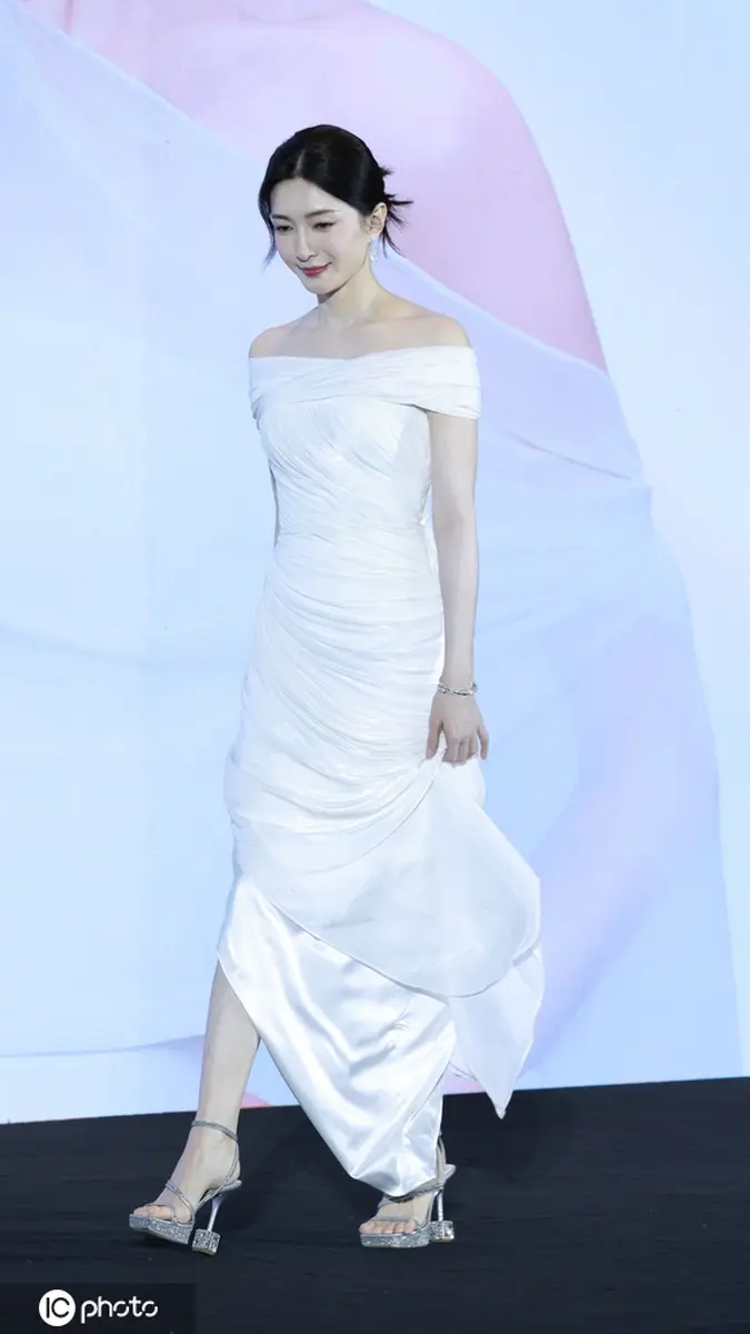 江疏影现身珠海出席活动 白色一字肩礼服简约明媚