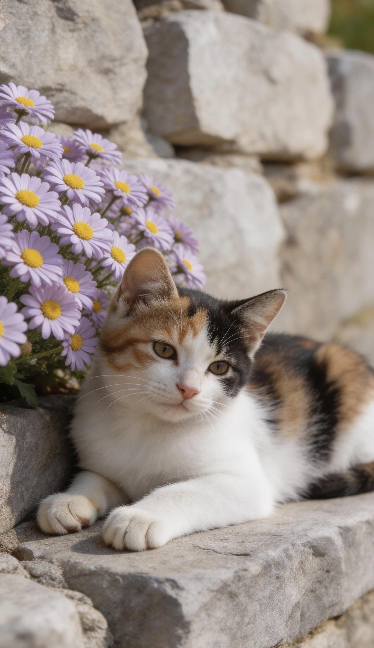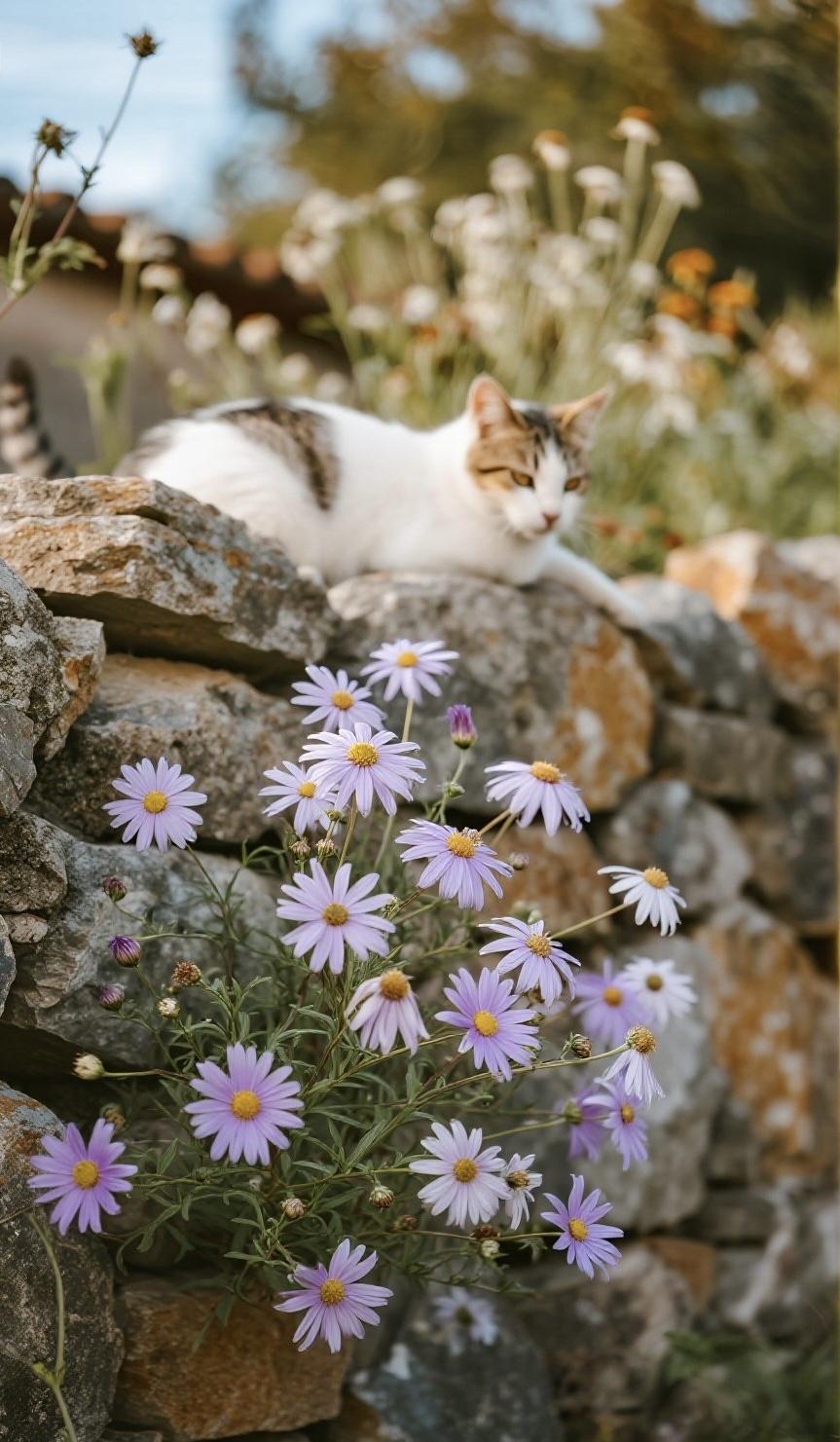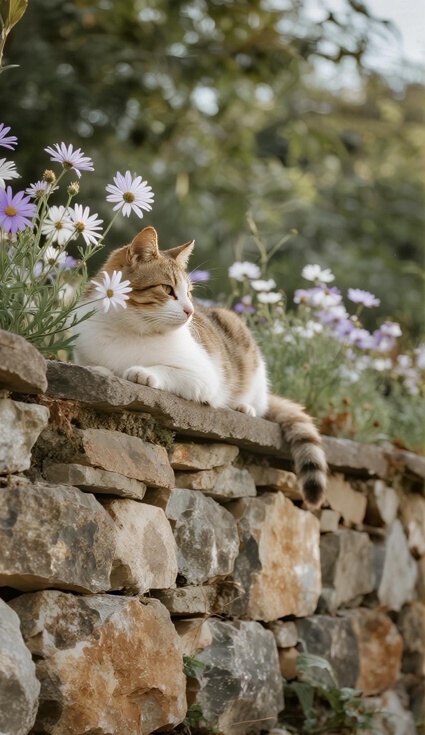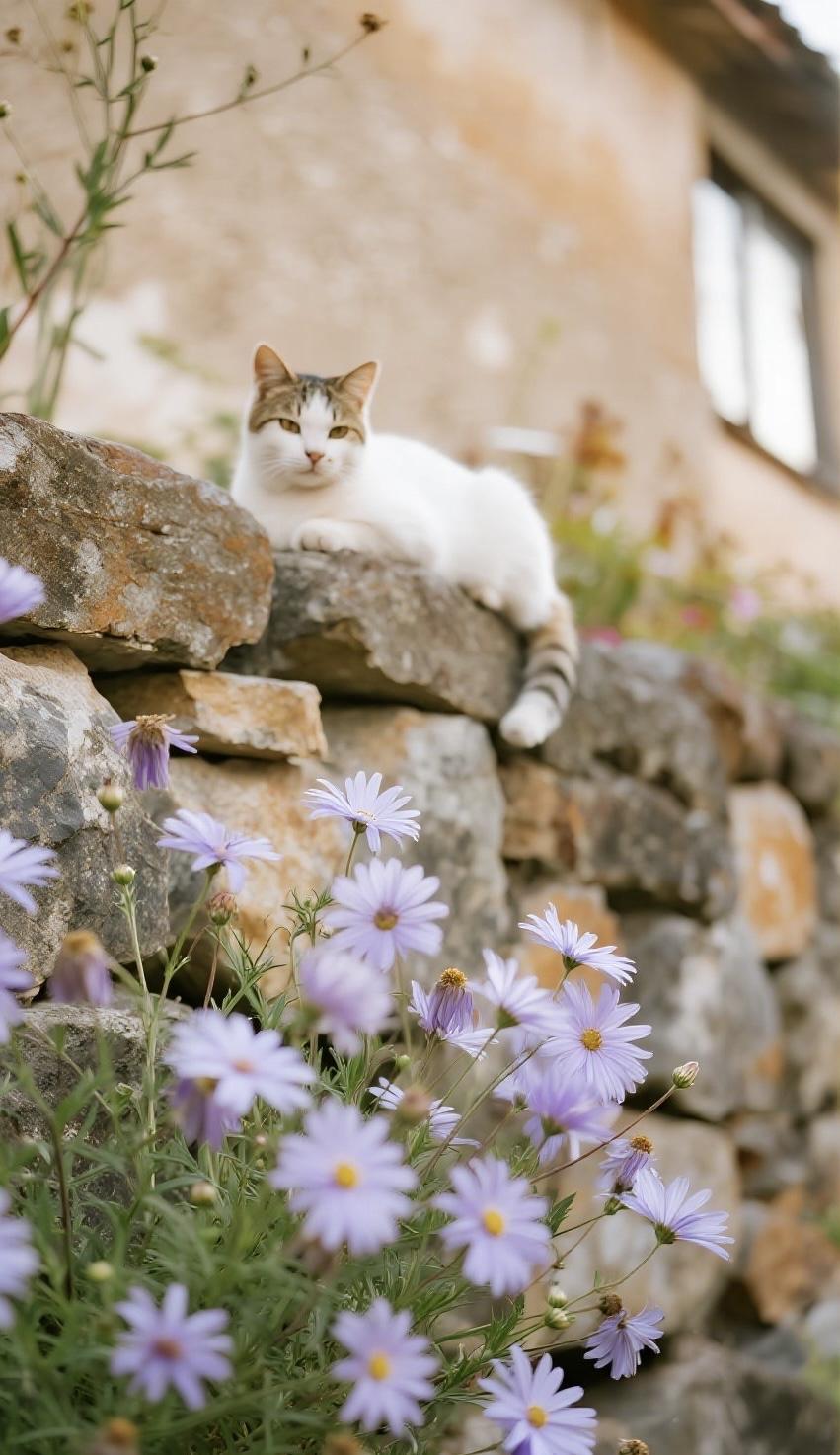 一只小猫慵懒地趴在石墙上,身子轻轻蜷着,脑袋微微低垂,似在小憩,又似在静静望着眼前的花。风轻轻拂过,花瓣微动,猫咪安稳不动,时光在此刻慢下来,满是温柔诗意。