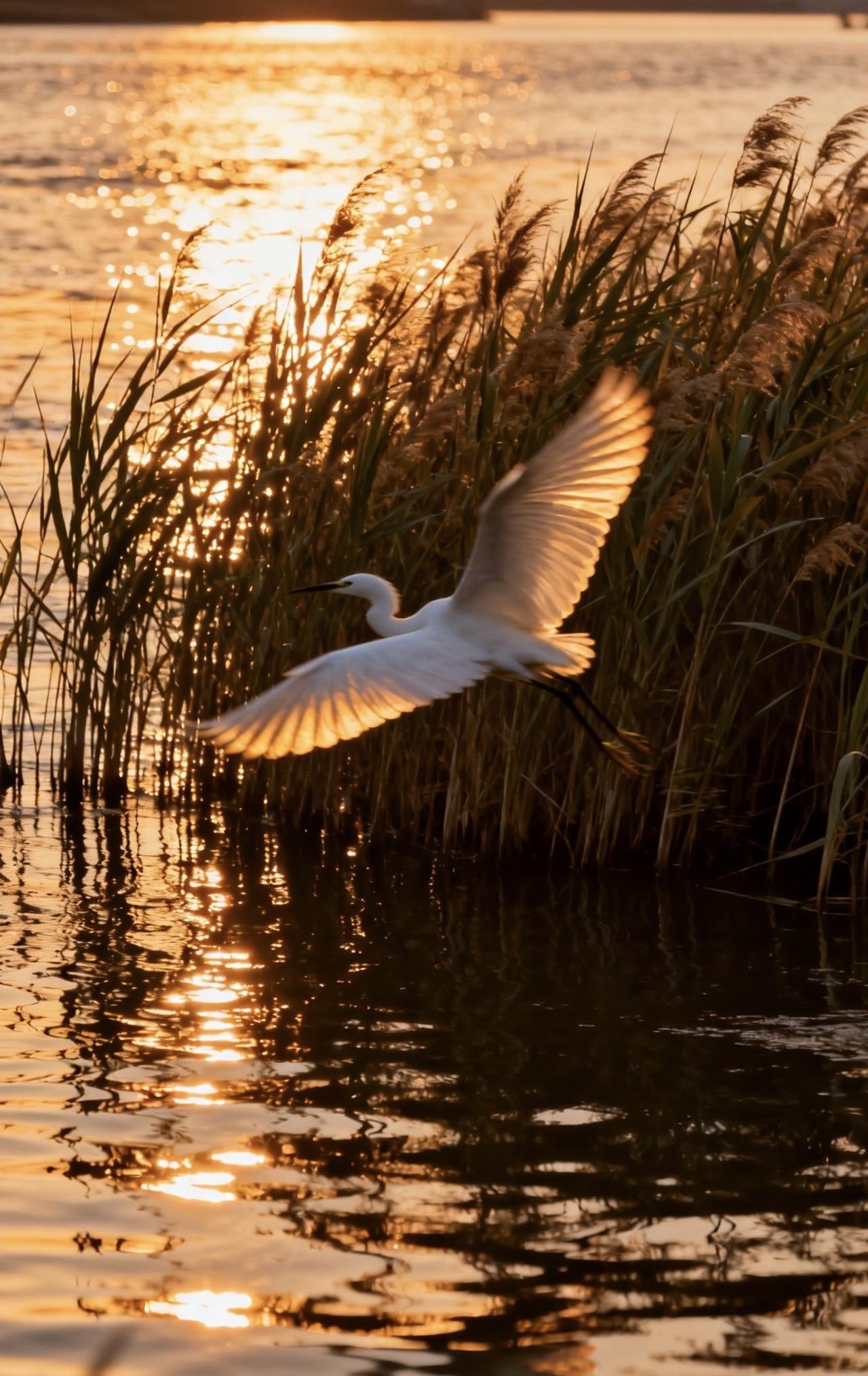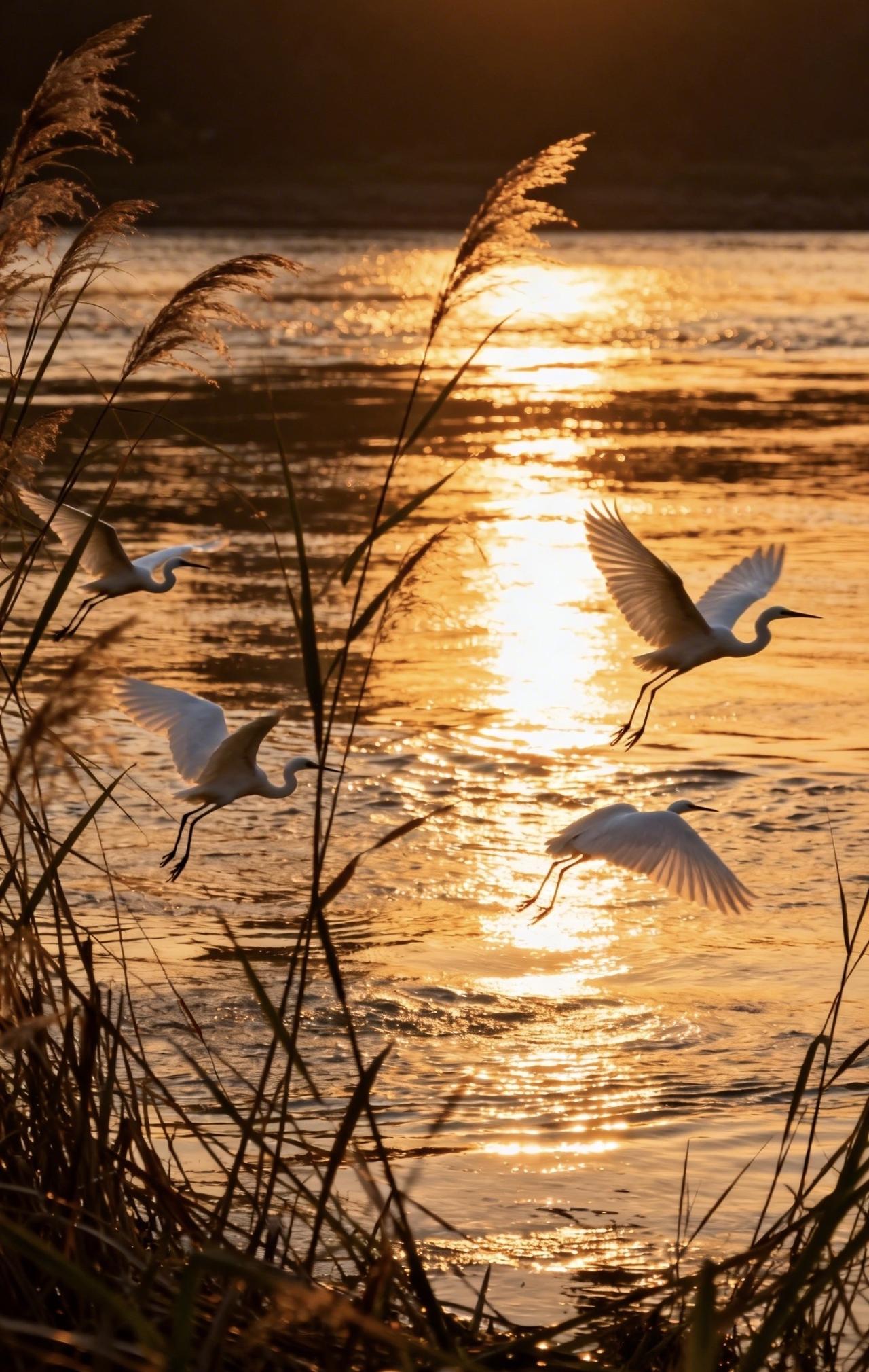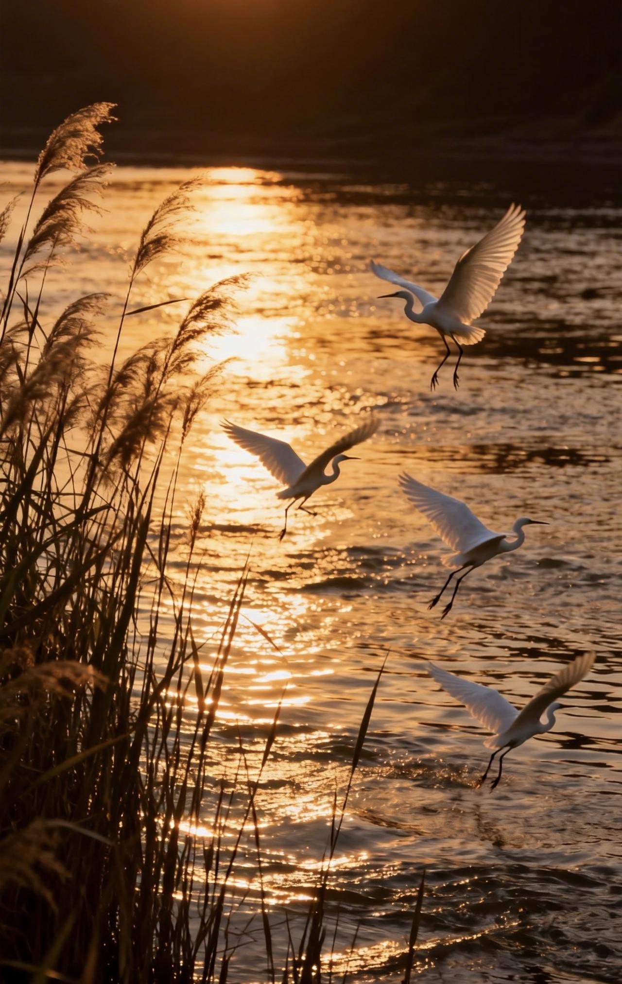 一阵风吹过,惊扰了几只白鹭,它们扑扇着雪白的翅膀,从江面掠过。天色渐渐暗下来,那洁白的身影在渐暗的水面上划过,就像是夜色降临前,在宣纸上轻轻落下的第一笔淡淡的墨痕。