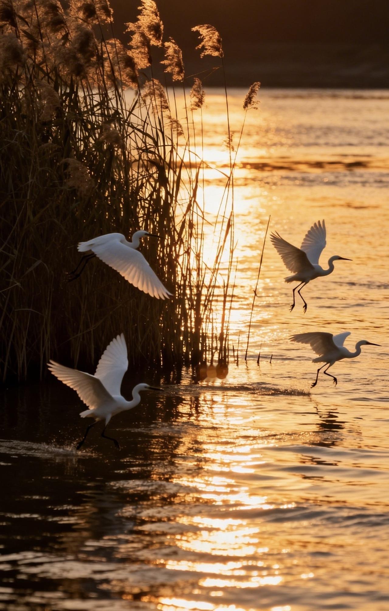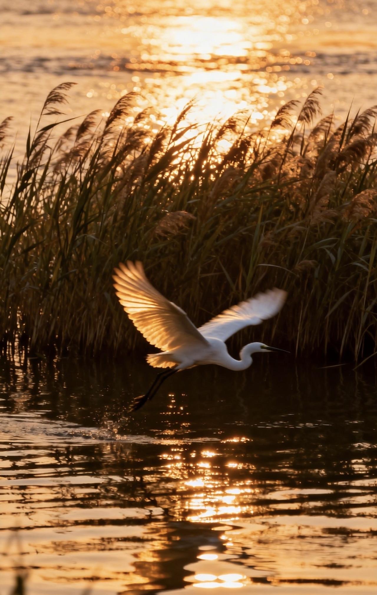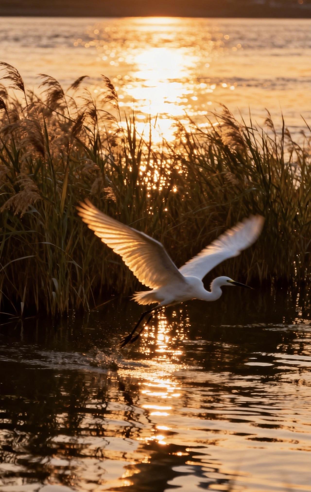 一阵风吹过,惊扰了几只白鹭,它们扑扇着雪白的翅膀,从江面掠过。天色渐渐暗下来,那洁白的身影在渐暗的水面上划过,就像是夜色降临前,在宣纸上轻轻落下的第一笔淡淡的墨痕。