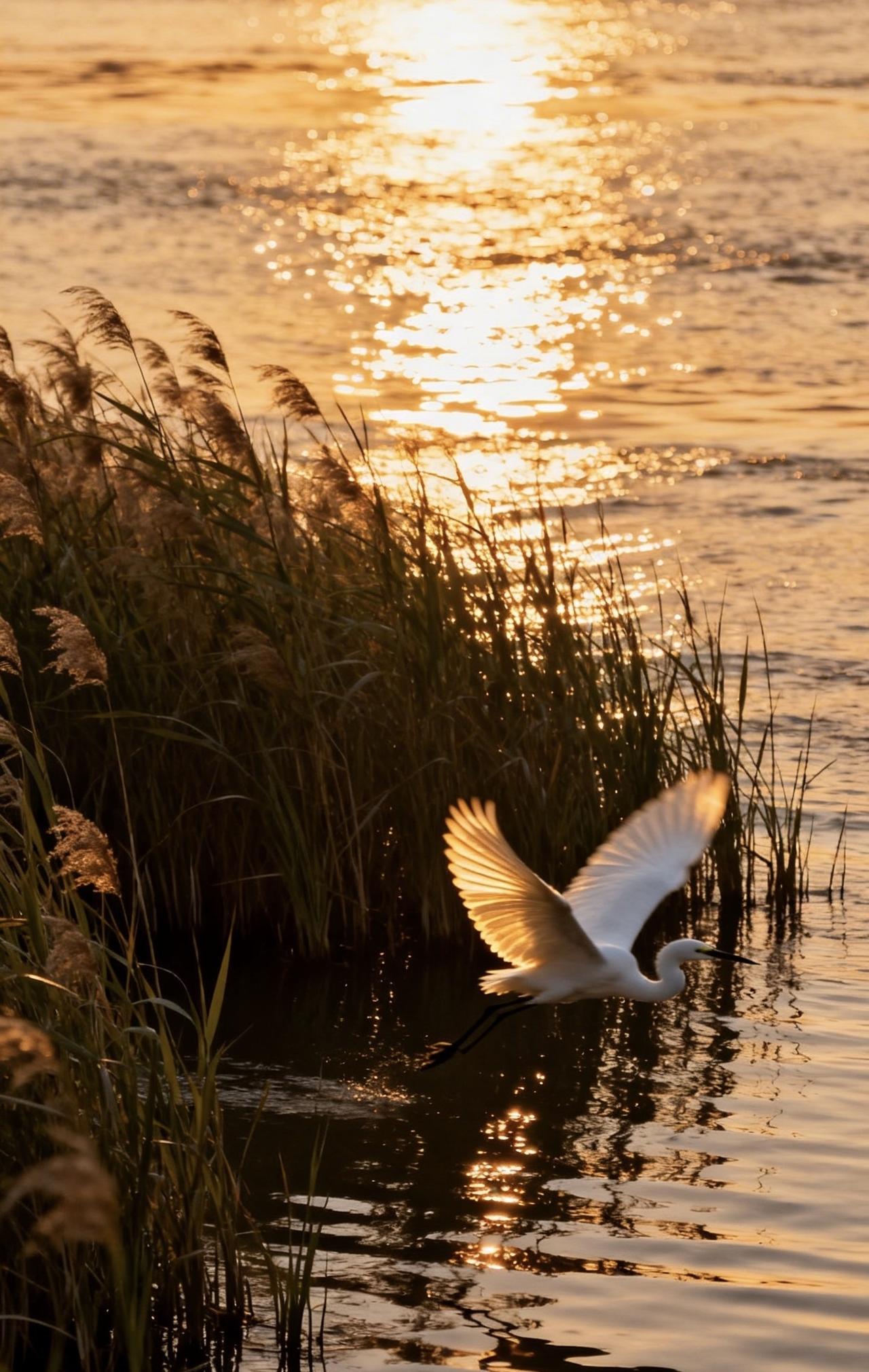 岸边的芦苇在风中轻轻摇晃,江水缓缓流动,把金色的光影搅得零零散散。