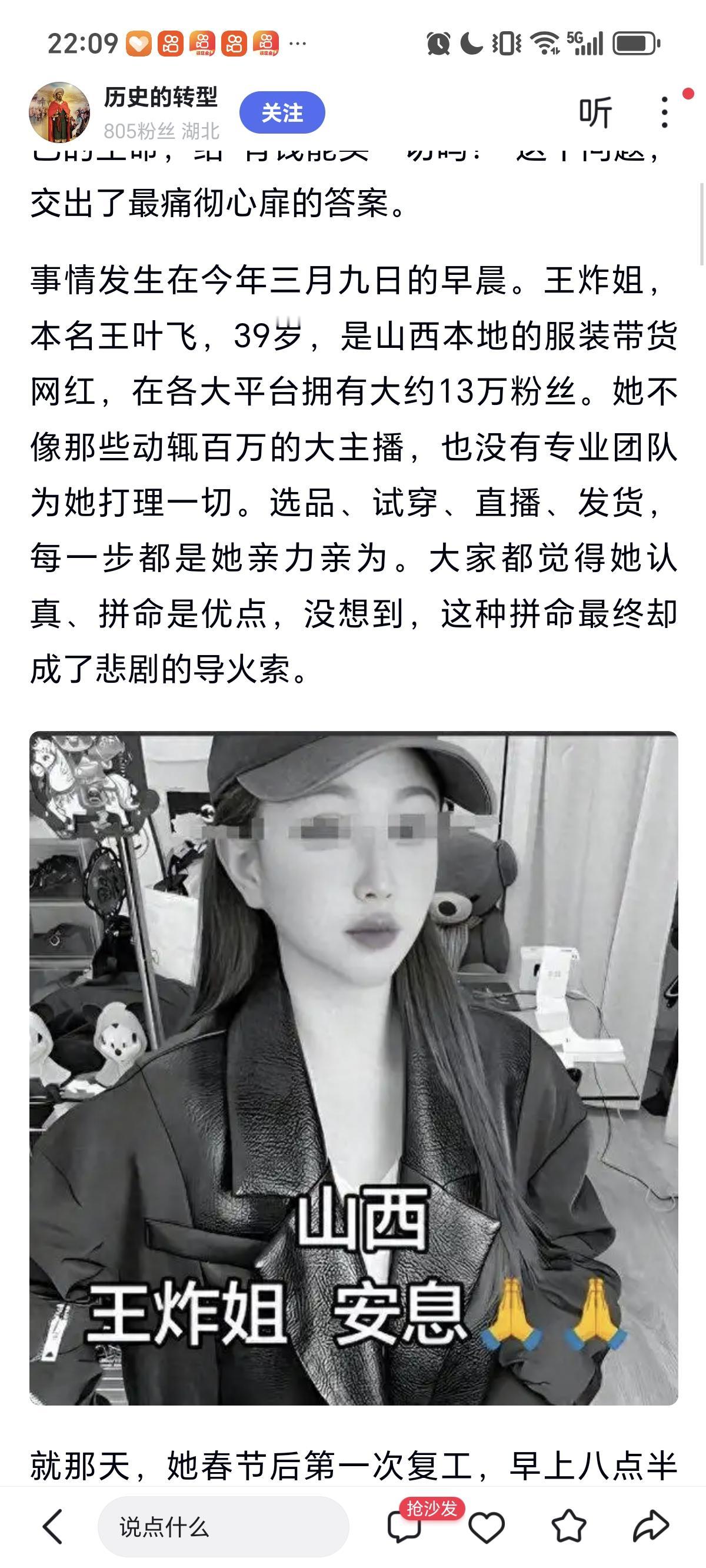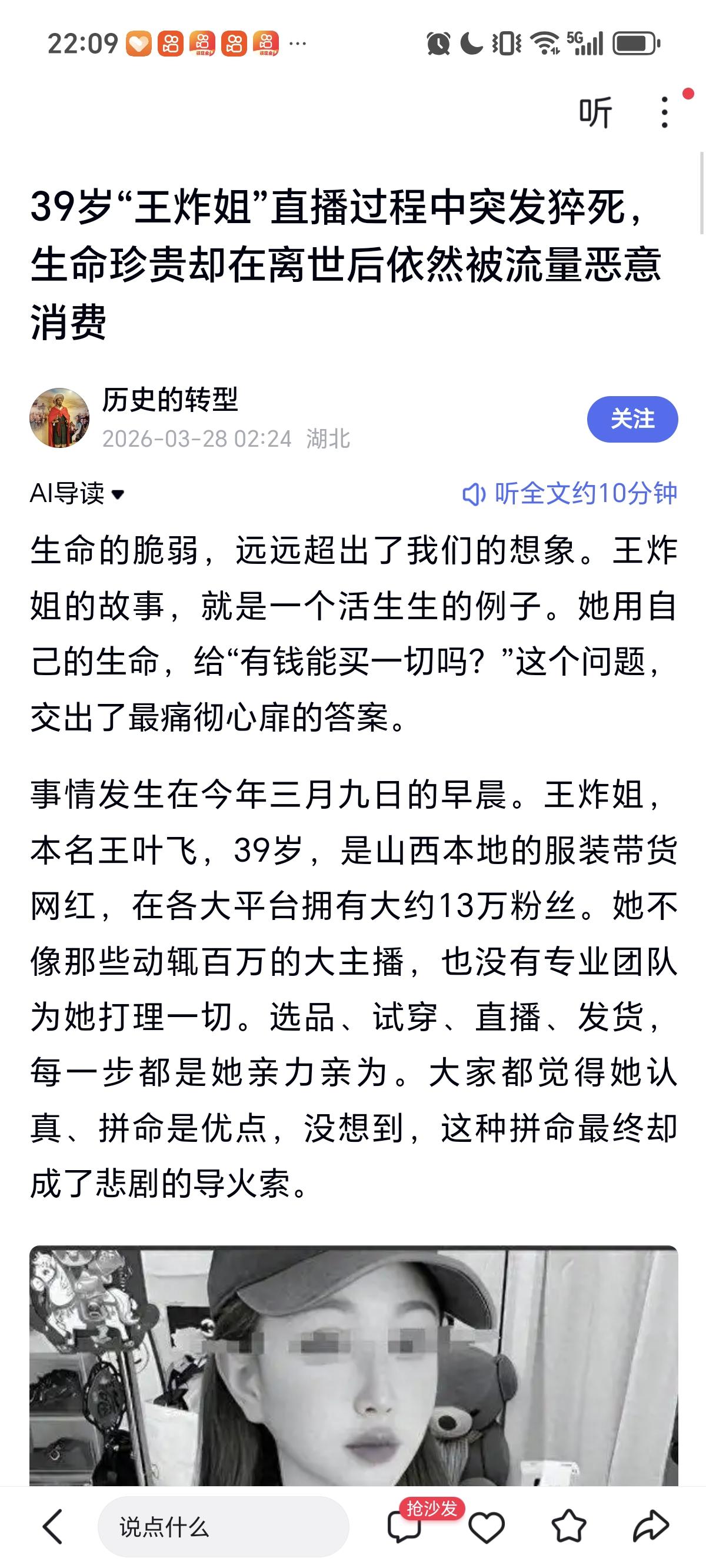 今年我们山西网红,王炸姐也是猝死的,我们不得不思考现在年轻人的压力,还有生活方式有问题,也许是现在吃的东西也有关吧,压力大,休息不好,为了活得人上人,可最终亏了自己的身体,这也是对当前年轻人的警示,身体才是根本,追求身外之物无可厚非,但得注意自己的身体承受能力。