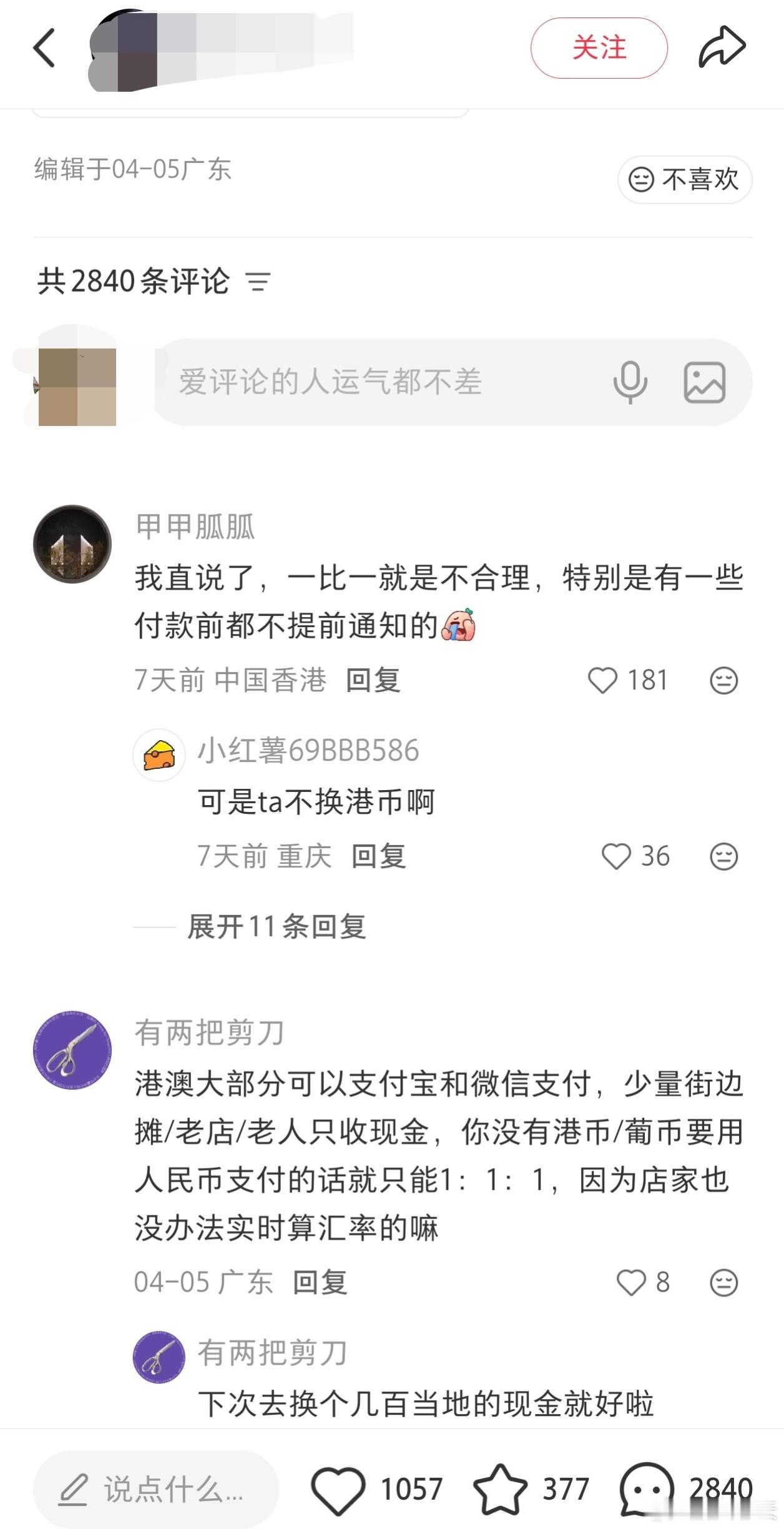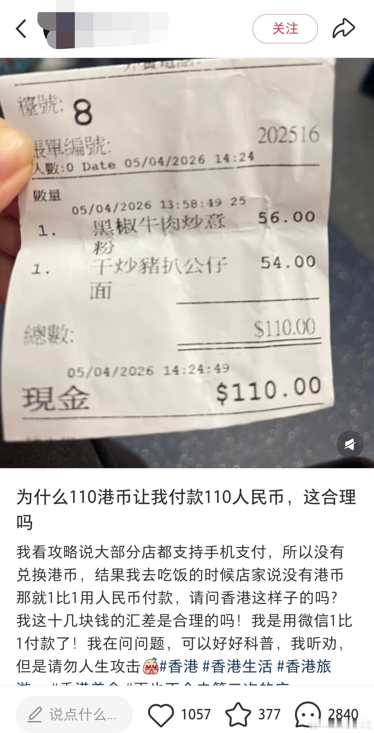 港媒:游客抱怨餐厅1:1微信收取人民币,网友称肯收就不错了香港01报道,有内地女生于小红📚发文表示,赴香港旅游前在网上看攻略说大部份店舖都支持手机支付,故没有兑换港币,没想到在香港餐厅用餐后,“店家说没有港币那就1比1用人民币付款”,最终她用了微信支付,1比1付了款。女生问道:“请问香港这样子的吗?我这10几块钱的汇差是合理的吗?”原文评论区有正反两面观点,香港01选取部分网民评论称,“这个店家很大概率没有开通微信商舖的收款码,是个人户,那收人民币就得自己去换,可能涉及手续费咯,就要1:1向顾客收,免得自己亏”,又说“其实老板肯收已经不错了,收多10几块钱,他要想办法把钱从大陆转出香港”、“其实你带给老板不方便,远远大过你多支付的几块钱”。粤港澳大湾区外籍乘客偷拍后网约车司机抢手机留证