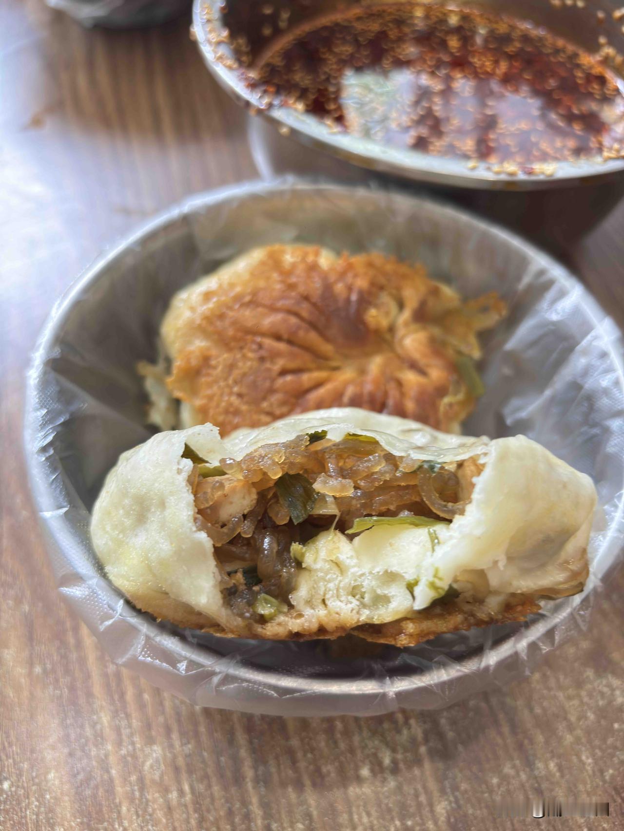 第一次吃商洛水煎包,这个皮很薄,一边硬一边软,口感层次丰富,脆香,劲道,吃的时候,一定要用辣子水灌一下,这样浸泡过的粉条软软糯糯,咬上一口,太美了。鲜香水煎包