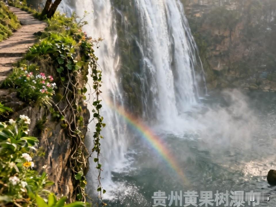 春日的黄果树瀑布,没了盛夏的磅礴,却多了份清新温婉。沿着山路走向瀑布,两旁满眼新绿,枯树抽出嫩枝,藤蔓爬满崖壁,野花星星点点。风带着湿润水汽和青草泥土香,让脚步都轻快起来。