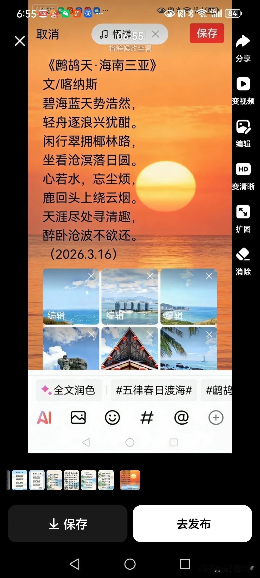 《鹧鸪天·海南三亚》 文/喀纳斯 碧海蓝天势浩然, 轻舟逐浪兴犹酣。 闲行翠拥椰