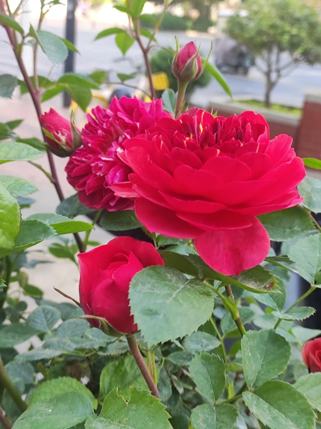 紫色月季,好香。军区南院马路边,有一条长长的镂空围墙,爬满了各色月季,其中最
