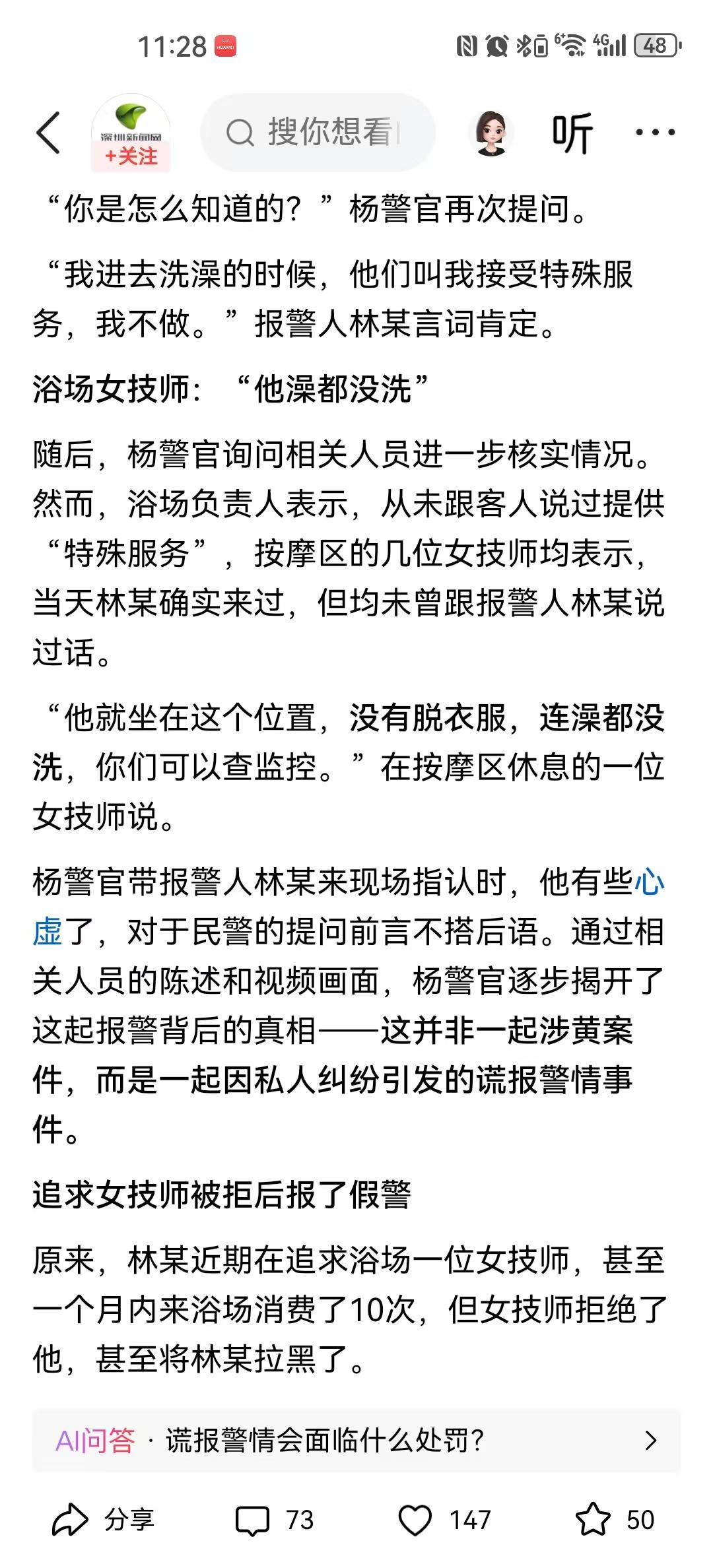 可是男子报警说自己追究的技师提供特殊服务的行为,着实恶劣了些,这不光是往技师脸上泼脏水的事情,还涉嫌谎报警情。