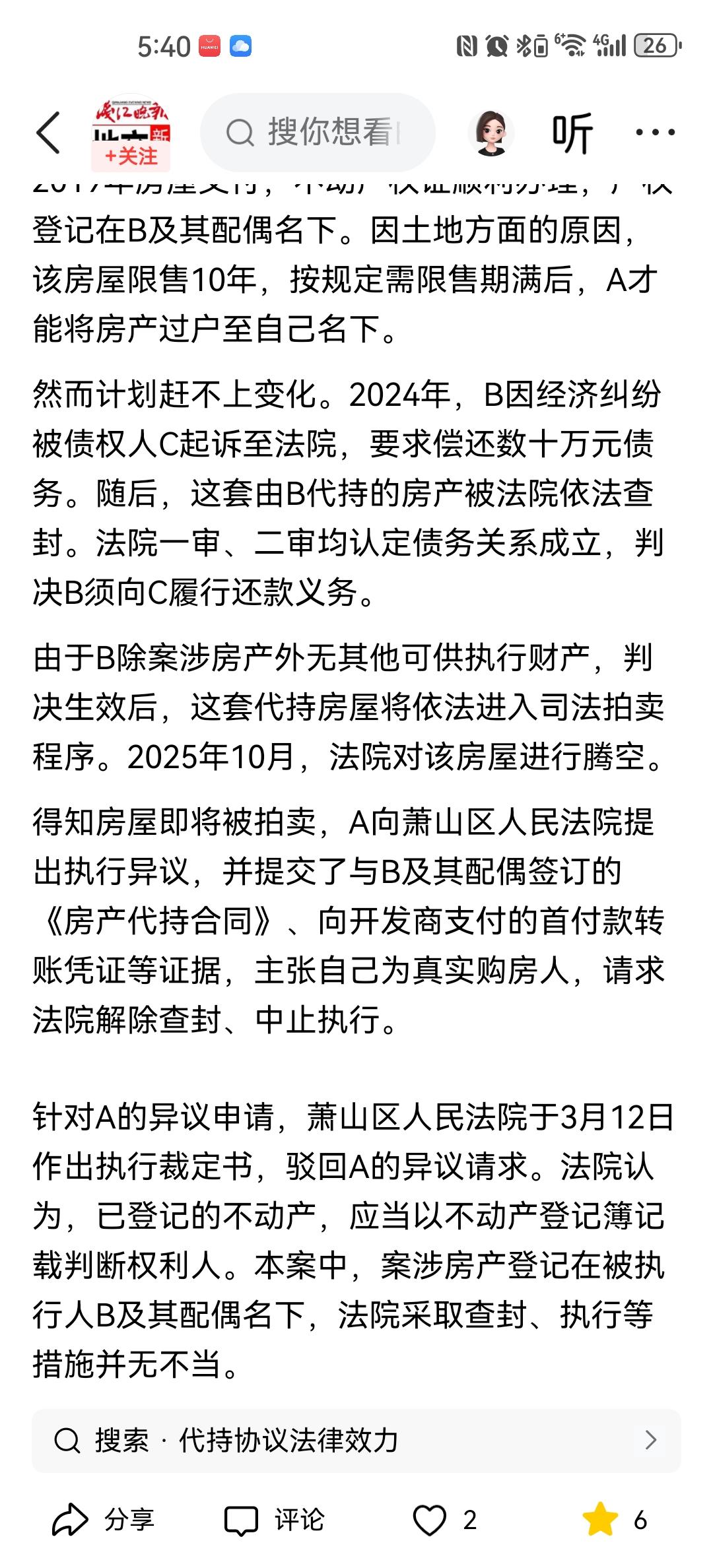 李佳赶紧提供之前与朋友签订的《房产代持合同》、房款支付凭证等,提起执行异议,但法院只认房本登记的名字,仍要强制执行。