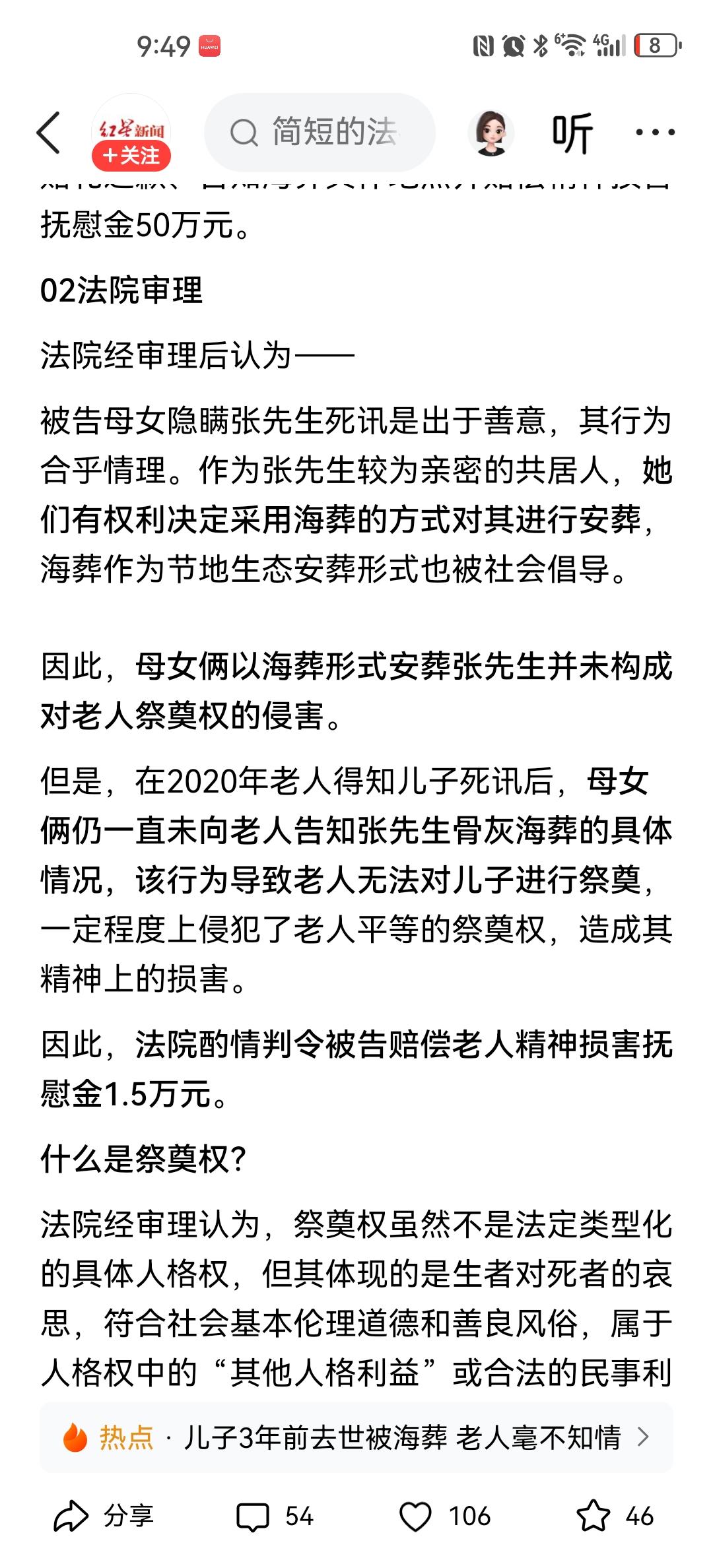 法院认为,儿媳和孙女有权利选择海葬,而隐瞒也是出于善意,这个理由可以令人接受。但是为何又判决要赔偿了呢?