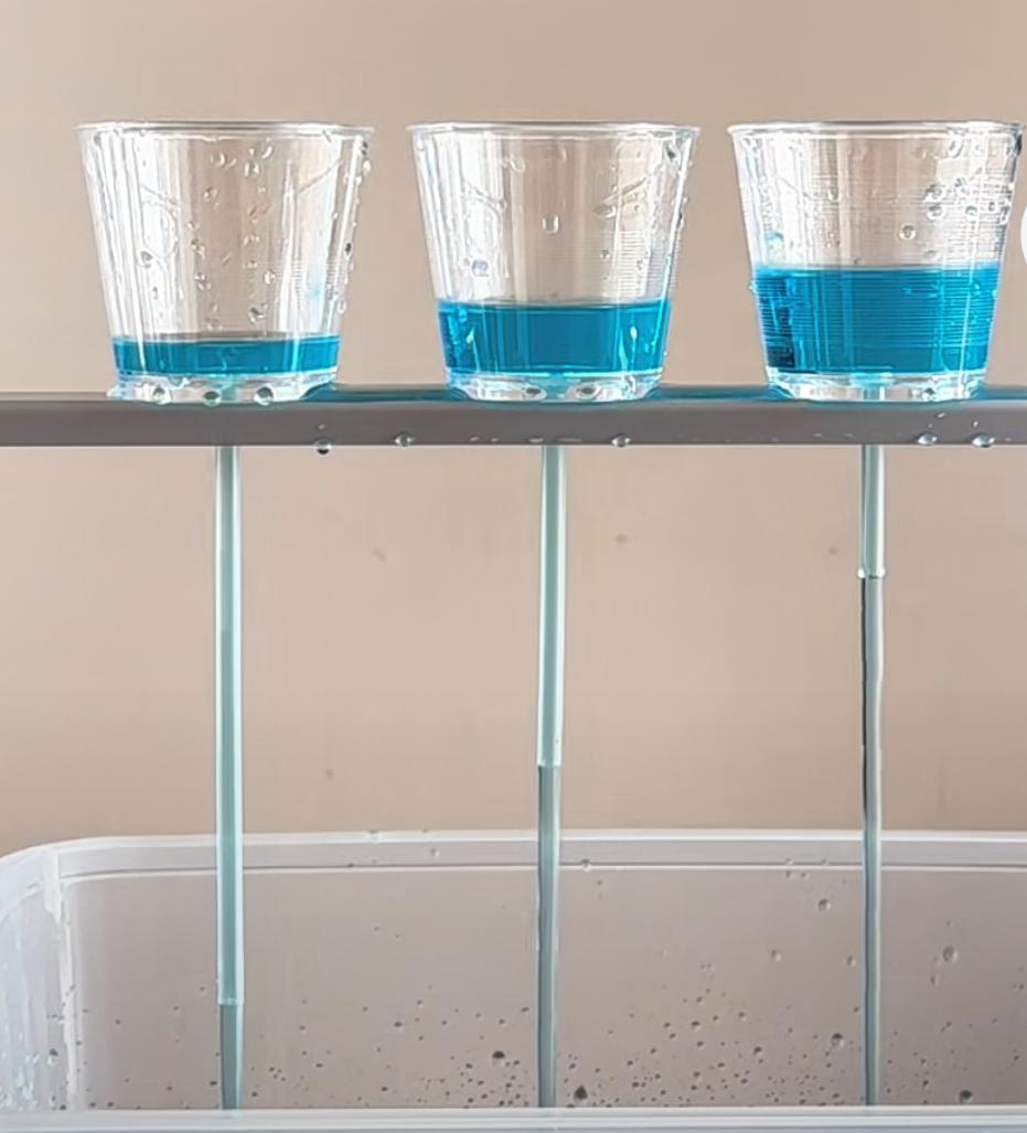 我们同时做三个相同的杯子,底部插上相同长度的导管,然后在三个杯子里装满水,首先声明一下,以上这三个杯子所做的一切是一样的。