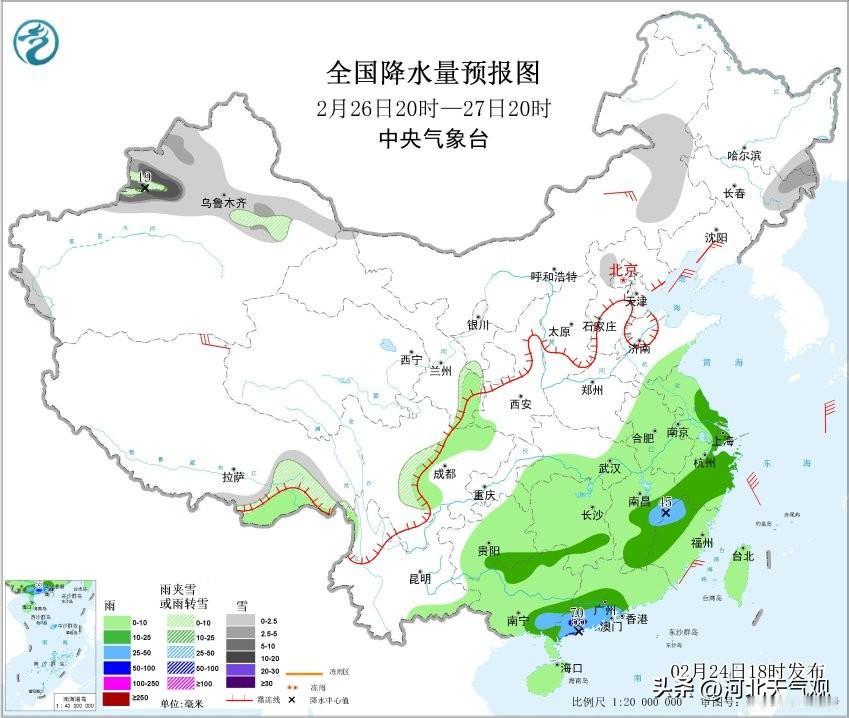 【京津冀雨雪观察】预计25夜间到26日夜间,我省大部分地区有一次雨雪天气过程。25日夜间为冷暖交汇降水,主要在保定东部,沧州,衡水,石家庄东部,邢台东部,天津,唐山南部,秦皇岛南部有小雨或阵雨(1-5mm),其他地区有零星小雨。26日白天到夜间,有明显的东风回流形势,中西部地区雨雪明显。西部山区有雨夹雪或中到大雪,保定,北京(雨雪不稳),石家庄,张家口南部,沧州西部有小雨或雨夹雪,其他地区有零星阵雨。请防范!另外,28日我省中南部地区可能出现降雪。注意出行安排!京津冀降雪 华北降雪预报 河北预报 河北多地迎风雪 华北天气预报 廊坊雨夹雪 沧州降雪降温