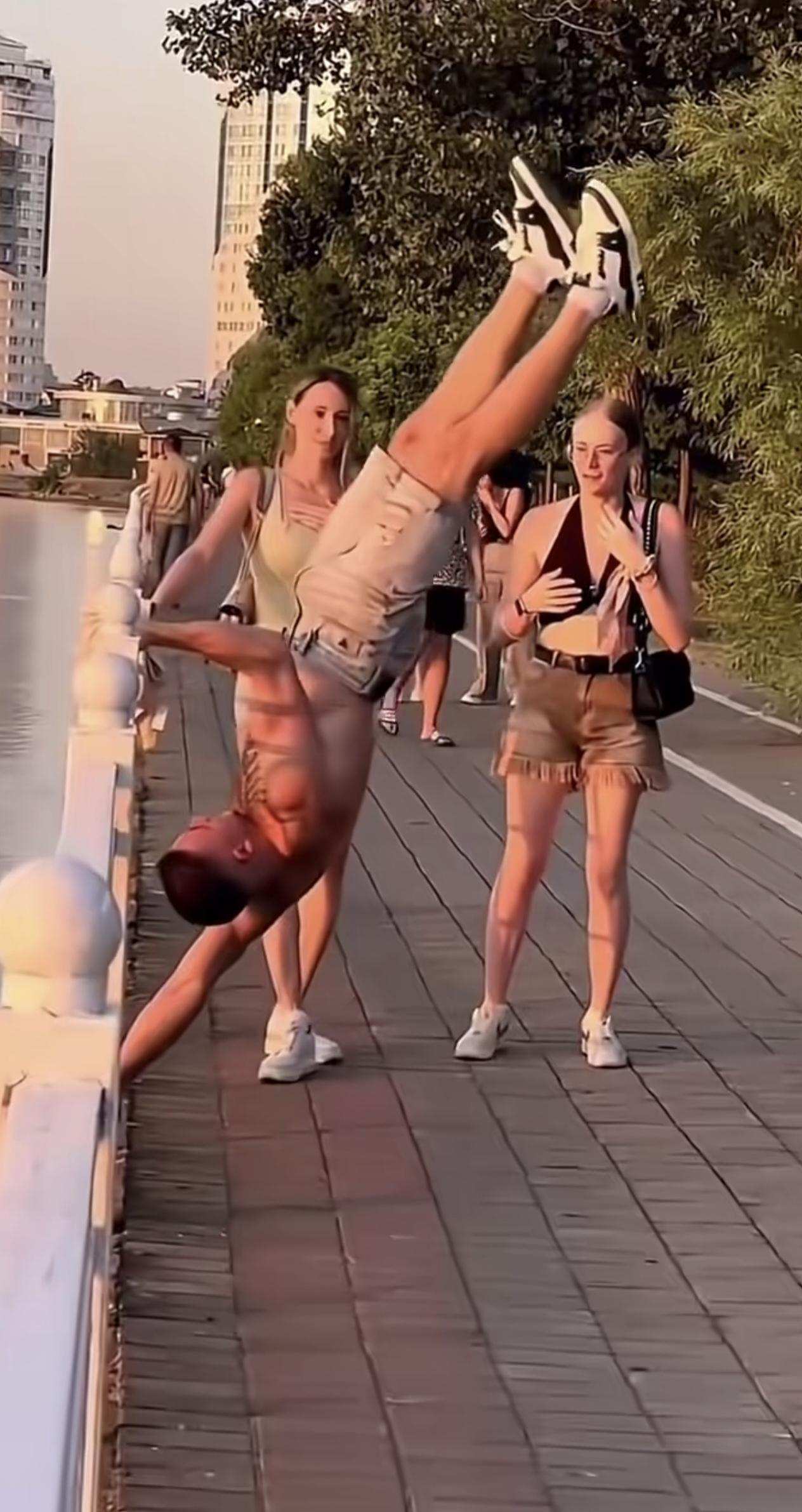 老外身大力不亏,各种动作竟然没有撼动看似轻巧单薄的石头护栏;