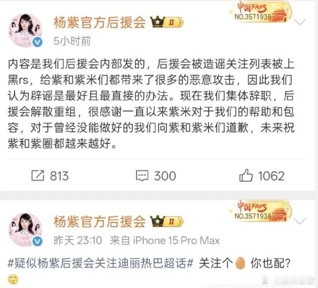 杨紫后援会宣布集体辞职解散重组!昨天杨紫后援会被发现关注迪丽热巴超话,后援会的回应是工作人员误操作,已经把工作人员开除了,随后在热搜评论区发表“关注个蛋,你也配”的攻击性言论,导致舆论升级,一些粉丝开始翻旧账,质疑后援会长期财务不透明以及管理混乱问题,重压之下,后援会宣布集体辞职解散重组,其实也就走走形式,最终还是那几个人重组,后援会从去年开始就拒绝向粉丝公示筹集款项的数额以及开支明细了,甚至连抽奖的奖品也一直拖欠着没发给粉丝。
