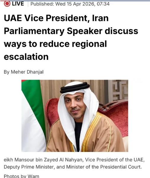 根据央视新闻权威报道,4月15日阿联酋副总统曼苏尔与伊朗议长卡利巴夫通电话,核心就是缓和地区局势、化解矛盾分歧。而就在两天前,阿联酋阿布扎比王储刚结束访华行程,这个时间差,明眼人都能看懂其中的深意。