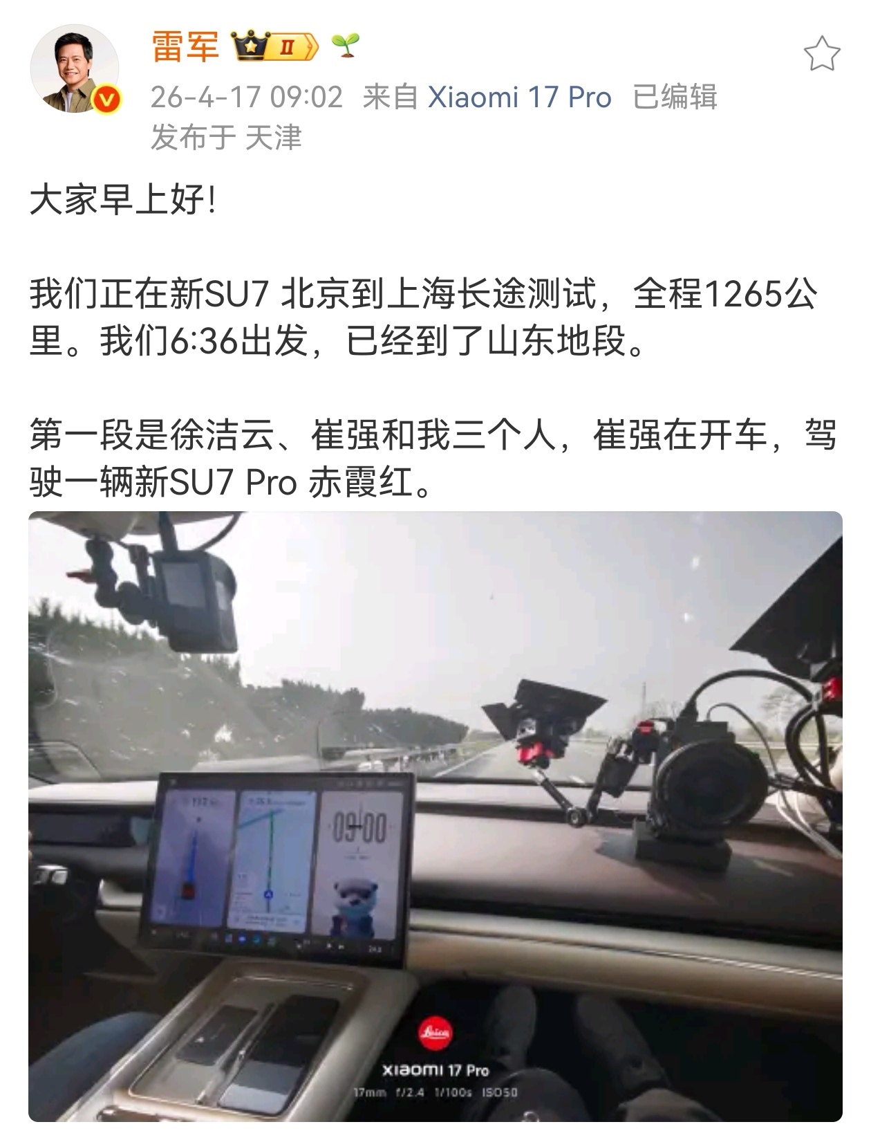 4月17日,雷军直播从北京开到上海,全程约15小时,实测1265公里长途续航。56岁的雷军太拼了,从28岁担任金山CEO,到40岁创立小米公司,再到50岁进入造车行业,小米能收获那么多米粉,除了产品极致的性价比,还始于雷军的人格魅力,他一直在路上,激励着无数米粉。雷军笑称直播超变态超疯狂雷军回应是否做10万以内车型