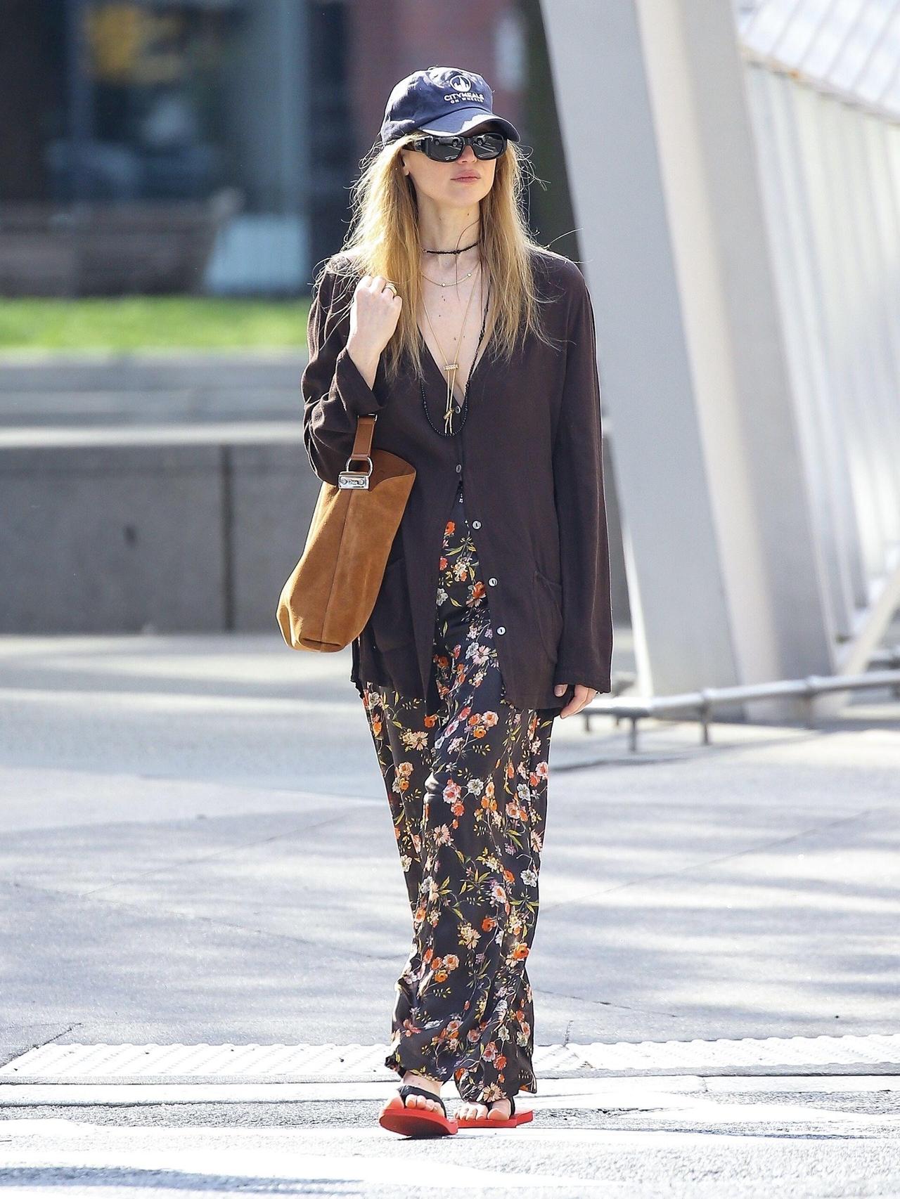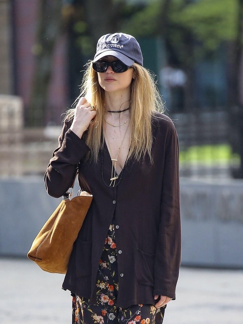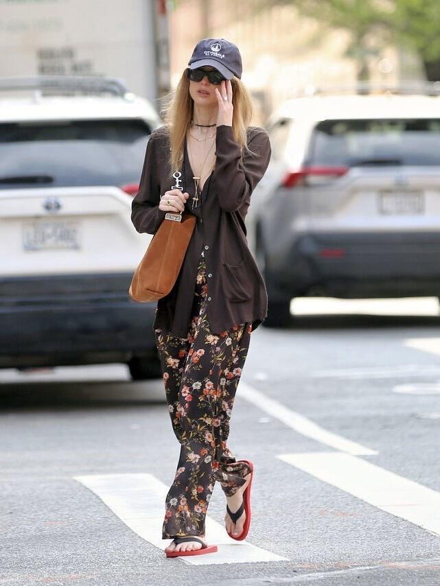 JenniferLawrence 纽约街拍,这一套随性温柔!深棕Ⅴ领开衫松弛感拉满,内搭黑底碎花阔腿裤,复古又慵懒。