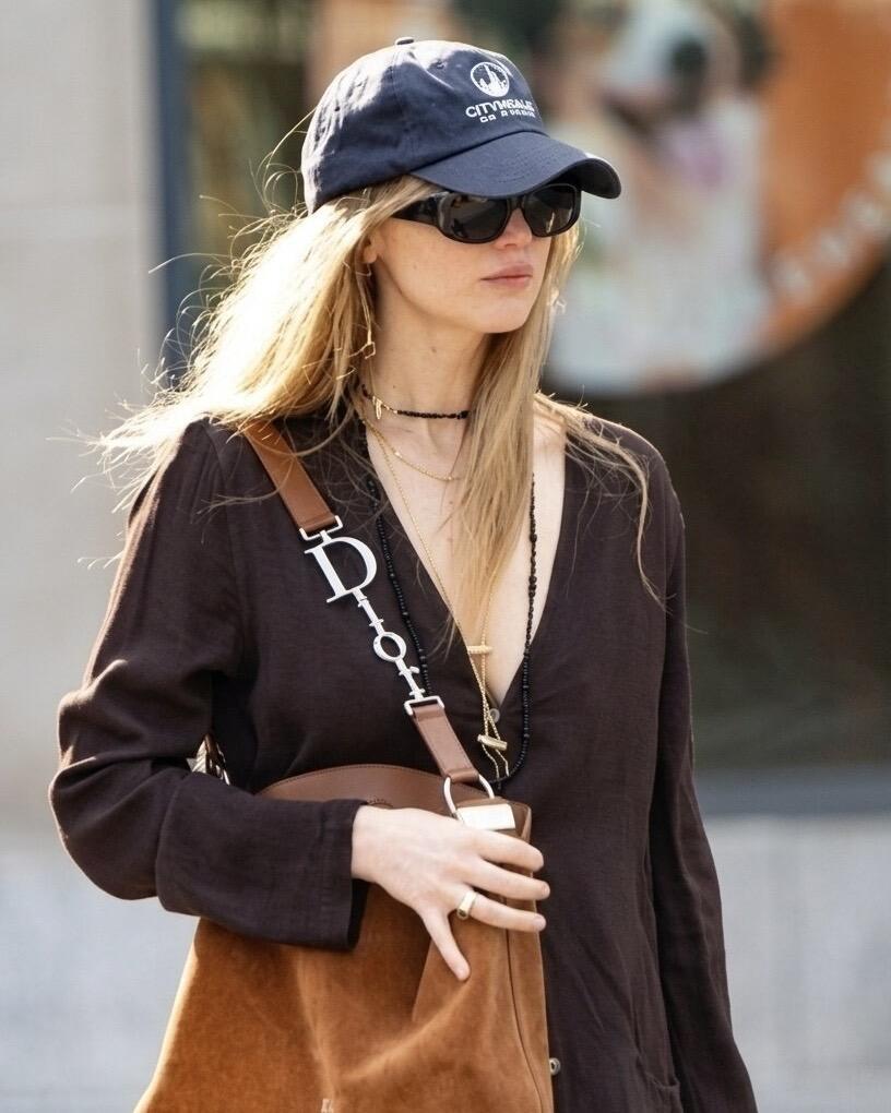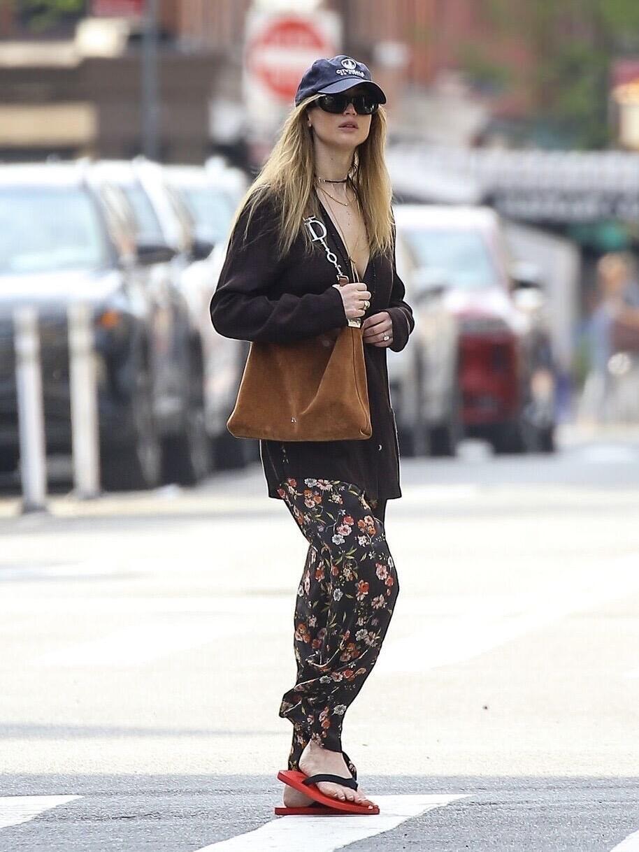 JenniferLawrence 纽约街拍,这一套随性温柔!深棕Ⅴ领开衫松弛感拉