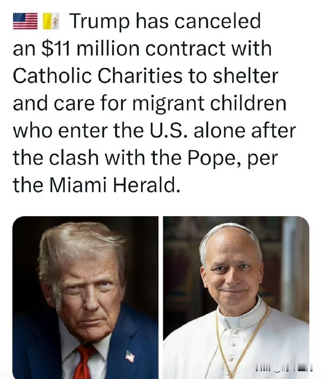 据《迈阿密先驱报》报道,在与教皇发生冲突后,特朗普取消了与天主教慈善机构价值1100万美元的合同,该合同用于为独自进入美国的移民儿童提供庇护和照顾。