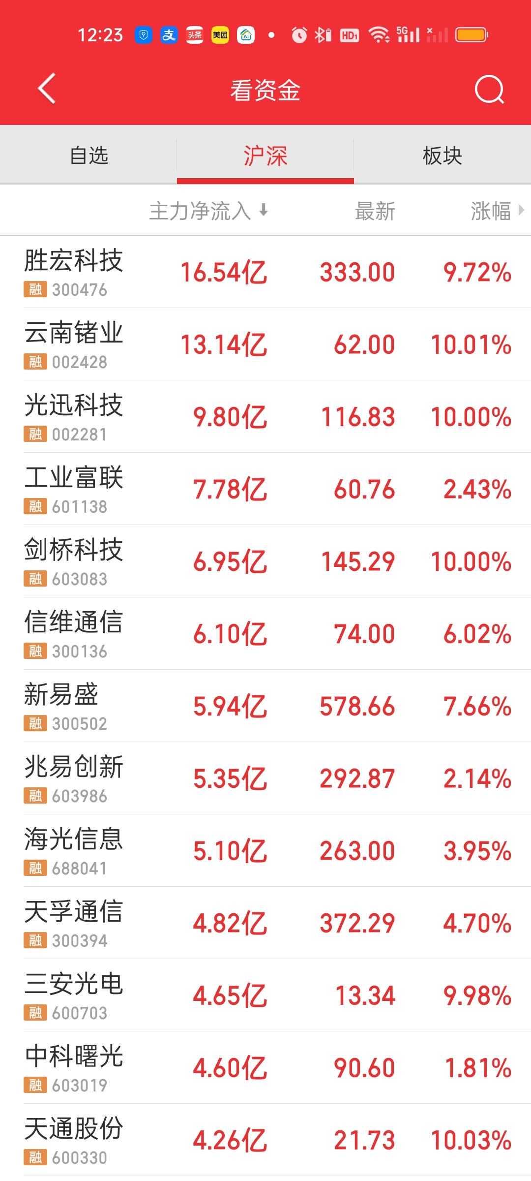 主力资金净流入方面,只有胜宏科技和云南锗业净流入资金在10亿以上,主力资金净流出方面,药明康德,贵州茅台,宁德时代,佰维存储净流出资金在10亿以上。