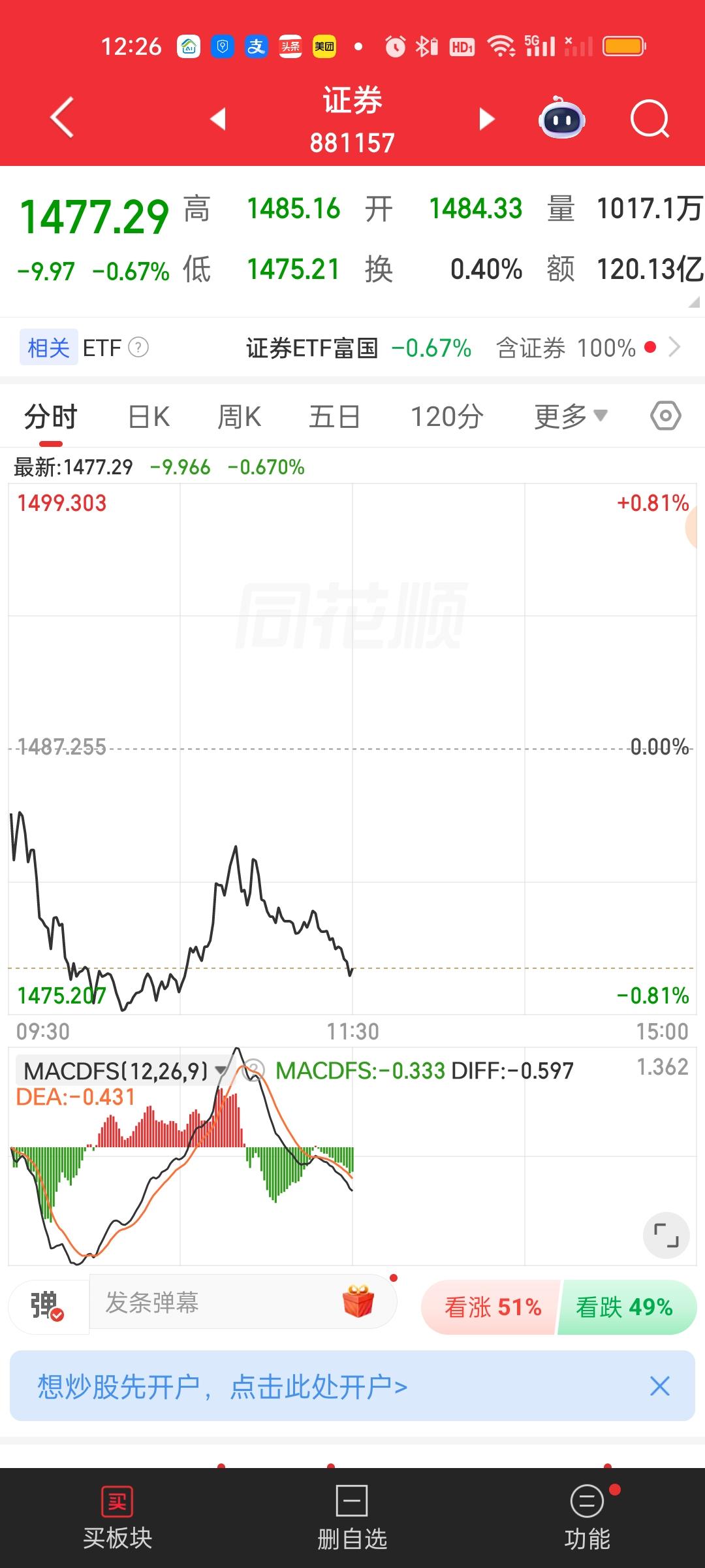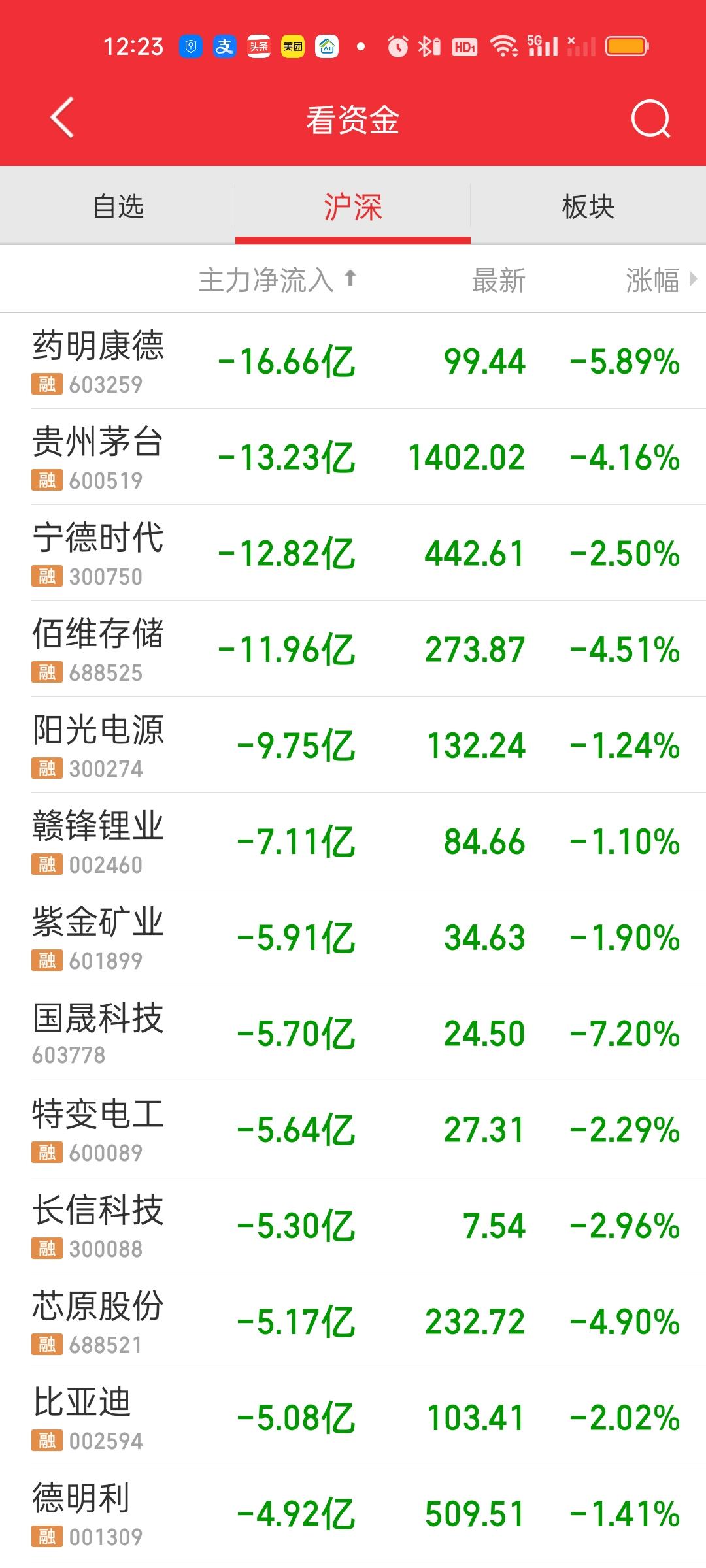 中午收盘了,大盘资金净流出的速度还在加快。成交量还是放量1200亿的。指数并没怎么跌,深指和创业板指今天反而又创新高了。个股超3770家下跌,涨跌停比54:6,看着上涨的家数还不少,但实际赚钱效应并不好。银行保险券商并没有要护盘的意思。今天是股指期货交割日,就算下午开盘指数有所反弹,也要提防最后半小时的急速跳水。