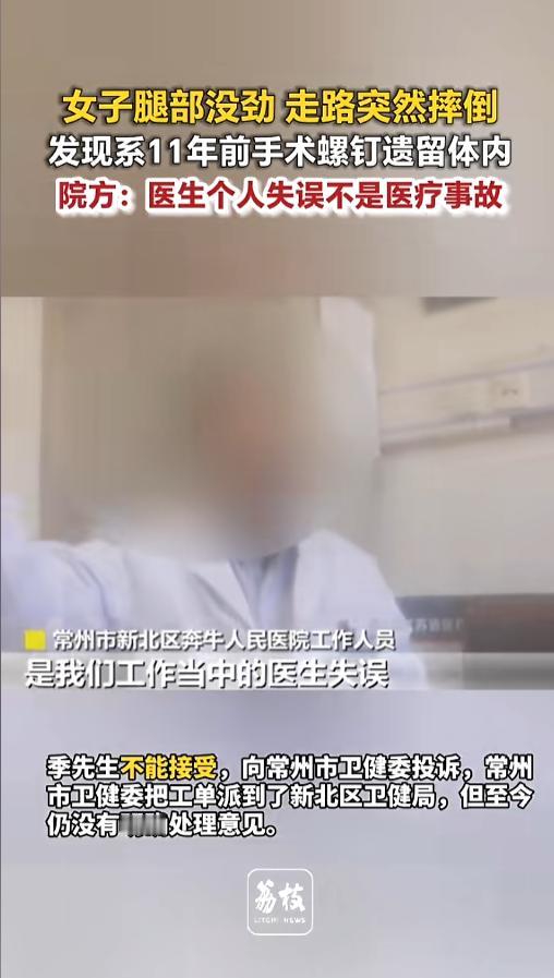 信息来源:《女子腿部没劲 走路突然摔倒 发现系11年前手术螺钉遗留体内 院方:医生个人失误不是医疗事故》荔枝新闻