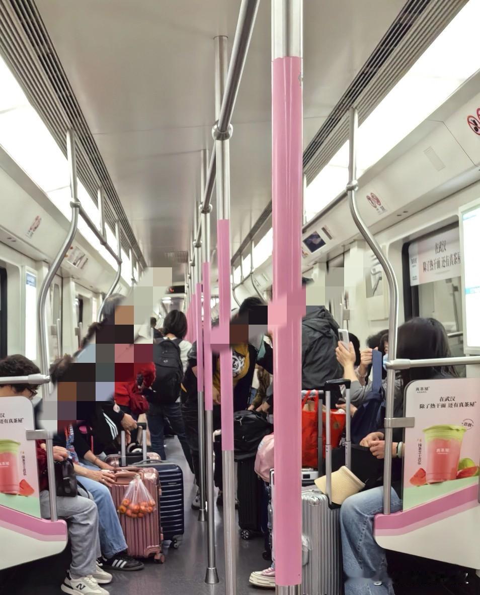 我今天从协和医院坐地铁回家。地铁上有几个大妈可能是要去天河机场坐飞机出去旅游,她们每一个人都推着大箱子。刚坐了一个站,旁边有人下车,就听到几个大妈站起来对着另外一个车厢大声喊,“**,快过来到这边集合。”