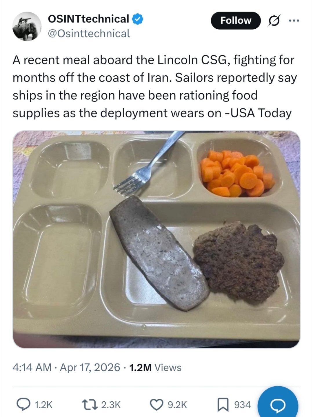 美航母士兵回应午餐仅碎肉和玉米饼¹ 看来特朗普一直封锁霍尔木兹海峡的代价也很大。航母和两栖攻击舰上的伙食跟不上了。² 前阵子吃过龙虾是真的,现在伙食供应紧张也是真的。