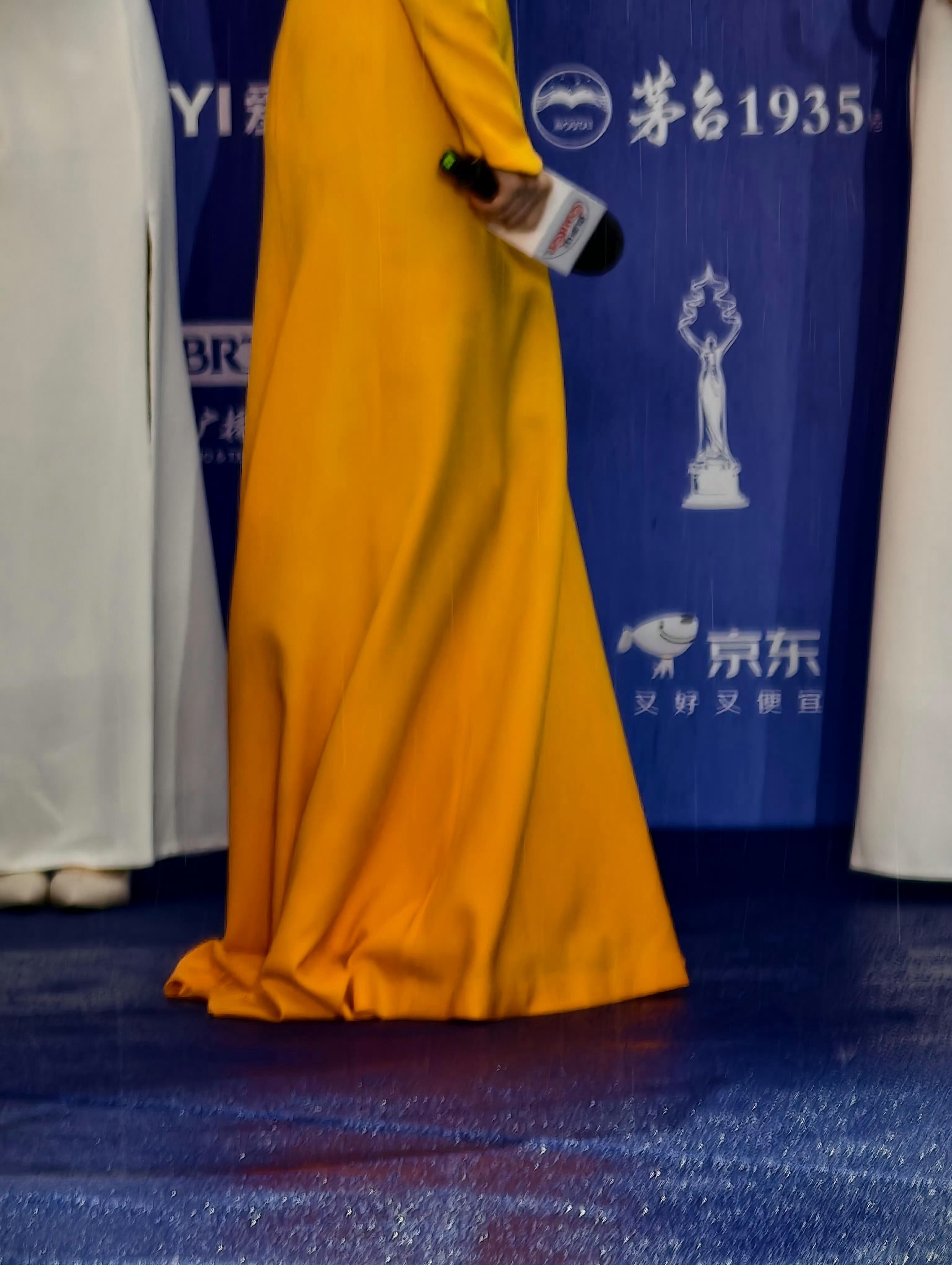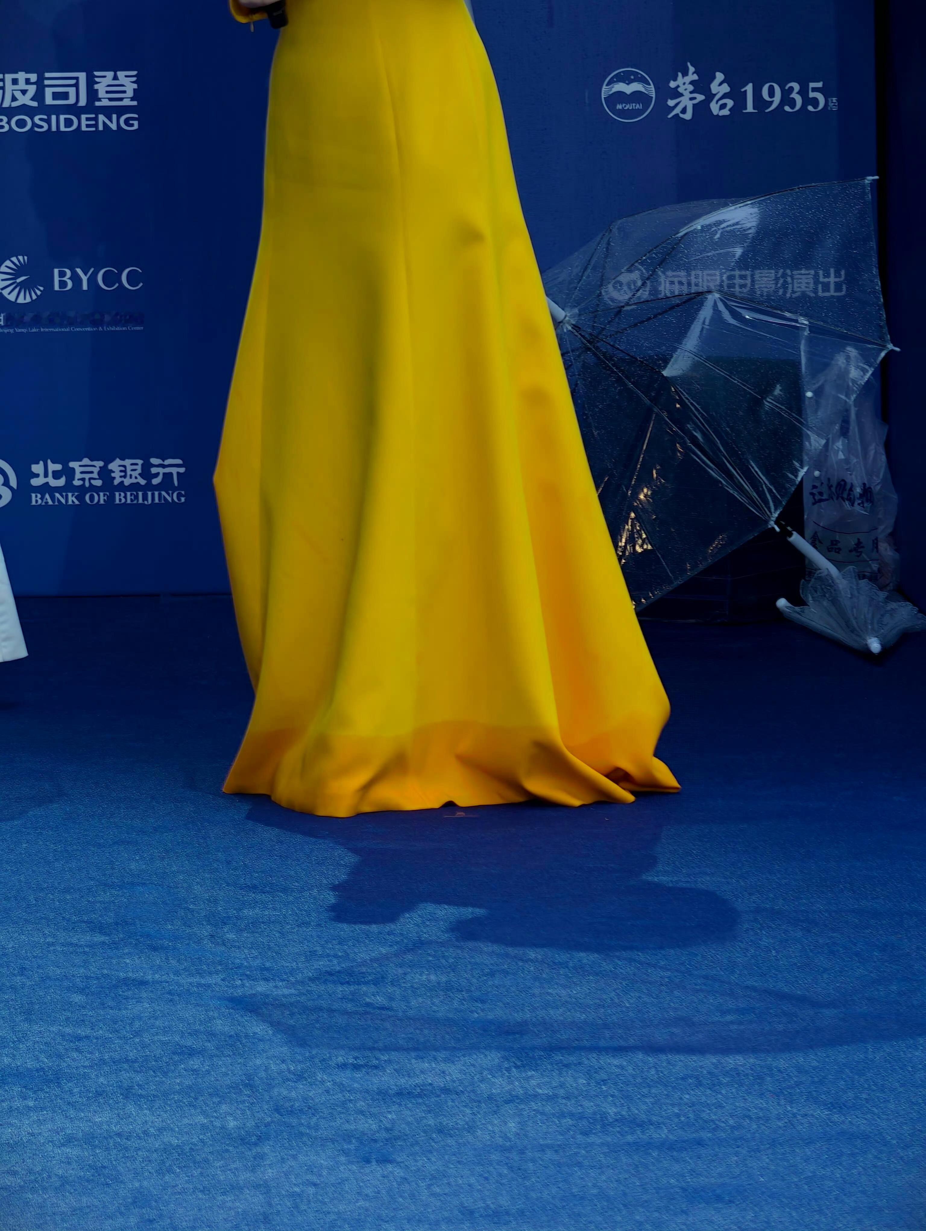 北影节主持人裙子 吸雨变色¹ 仔细看,表面上是从黄色变成橙色,实际上是颜色变深了