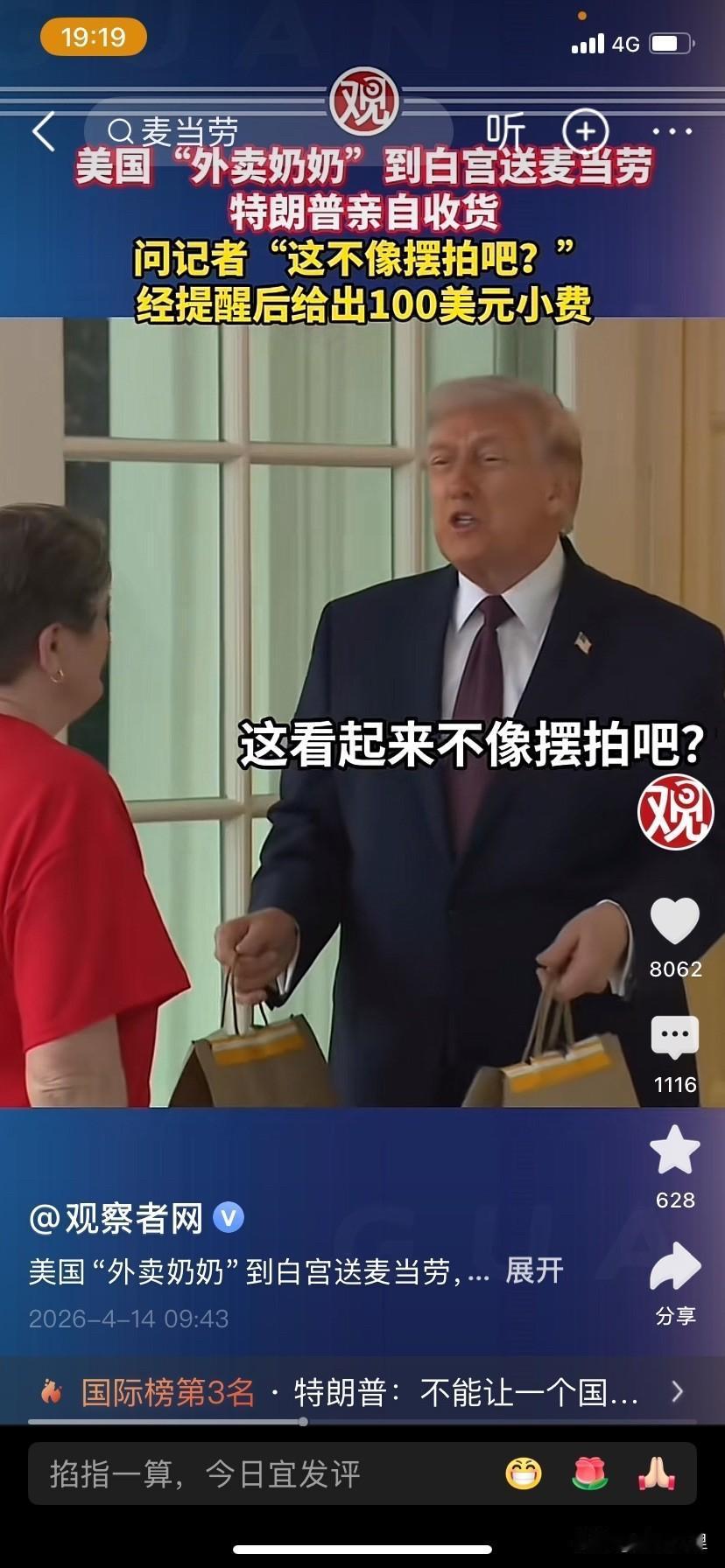 白宫的宣传部门策划了一出特郎普在白宫点外卖,一位六十多岁的大妈外卖员送货到白宫,特郎普亲自开门收货,还给了一百美元小费的短剧,白宫想表达什么?公知和美分一定会说,人家总统都吃麦当劳,没有专职厨师和营养师,太平易近人了,跟普通人一样,美国白宫可以随便进出,对老百姓不设防,这才是自信的总统和国家。呵呵,哄傻子玩呗