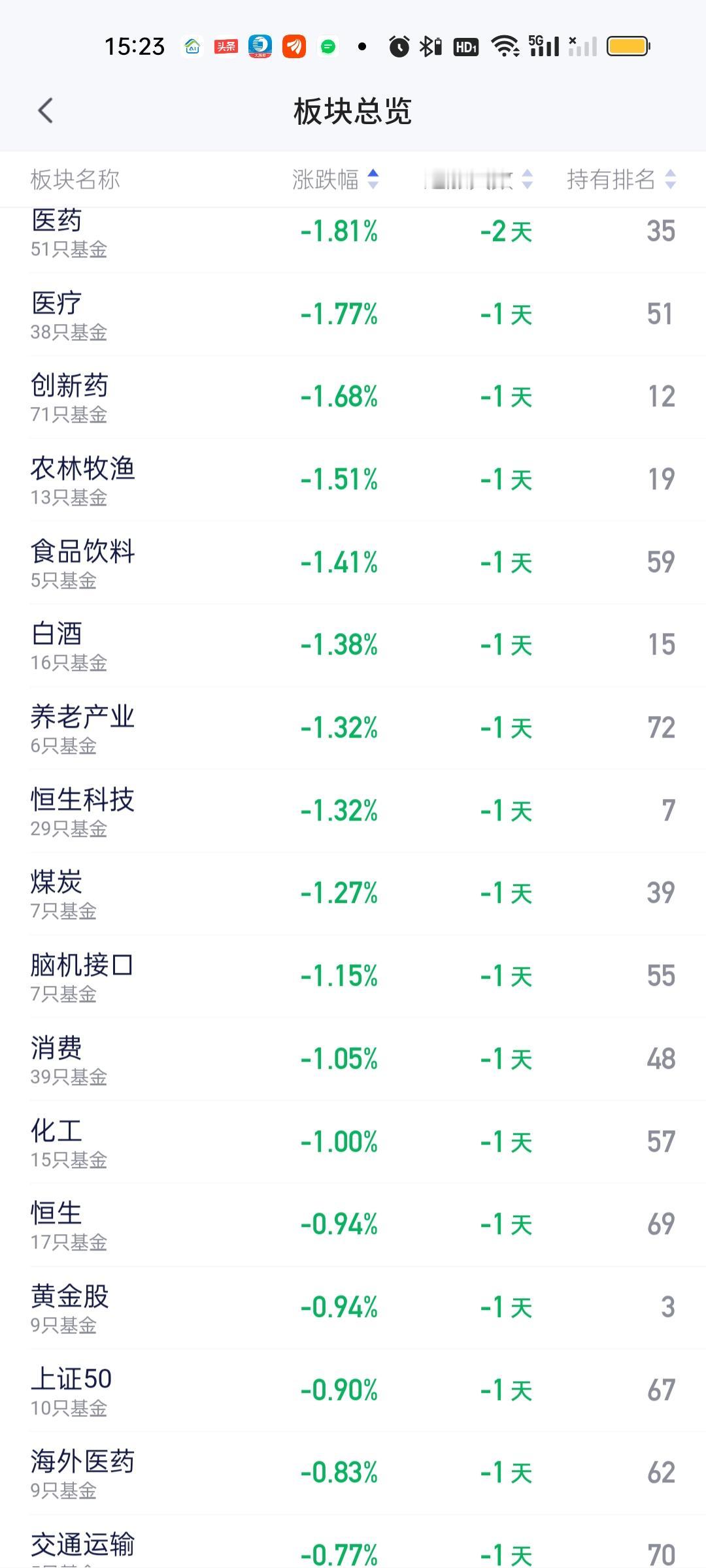 跌幅榜方面,总体跌幅有所收窄,上午收盘还有3个板块跌幅在2.20%以上,全天收盘最大跌幅缩小到1.81%,跌幅在1.50%以上的板块只有医药,医疗,创新药,农林牧渔。跌幅在1%以上的有食品饮料,白酒,养老产业,恒科,煤炭,脑机接口,消费,化工。