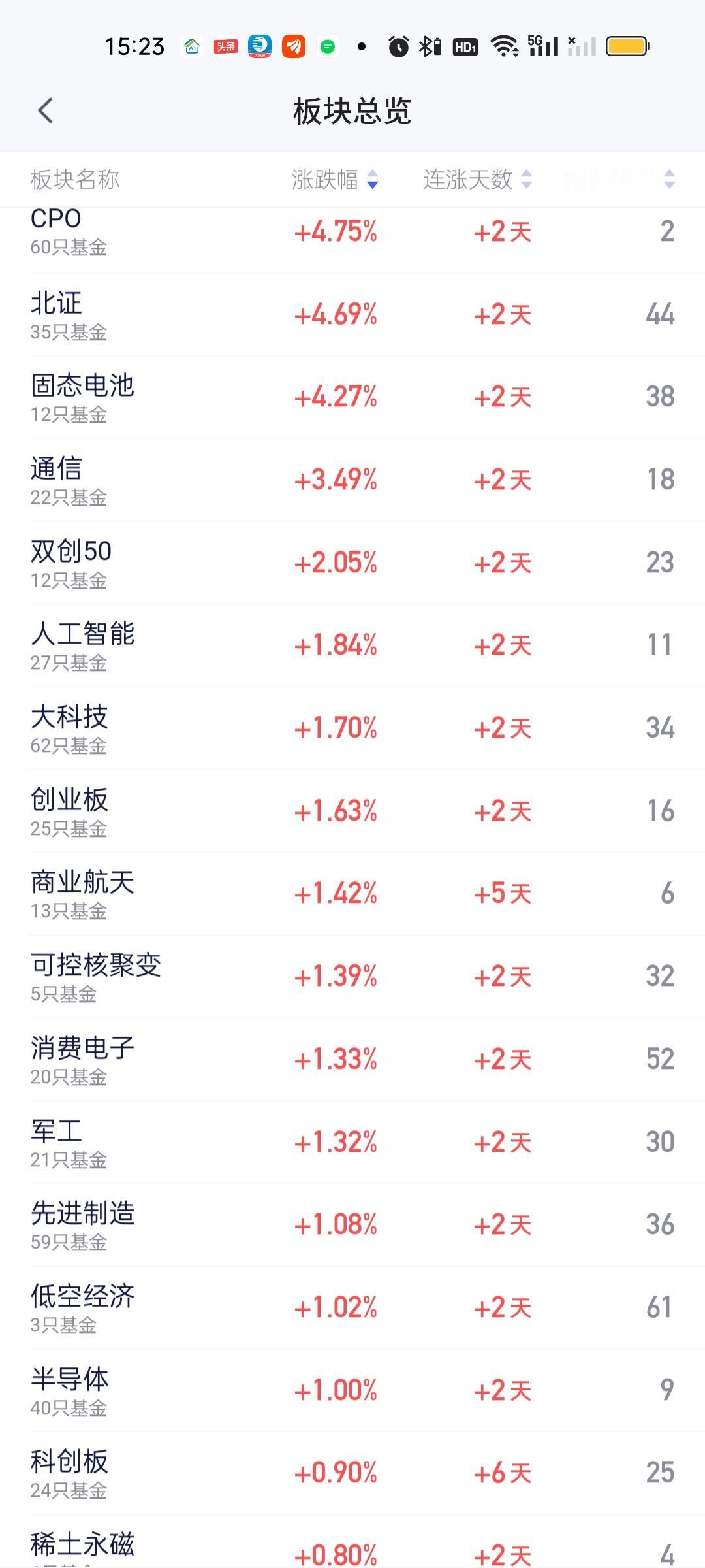 相比上午收盘CPO板块的一骑绝尘,一枝独秀,全天收盘北证50和固态电池强势崛起。这3个板块涨幅都在4.20%以上,外加上涨3.49%的通信。形成了今日涨幅榜的第一梯队。