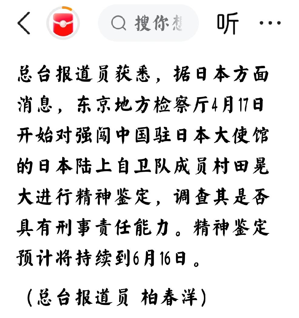 2026年4月17日,央视新闻发文:“日本东京检方开始对强闯我使馆不法之徒进行精神鉴定”