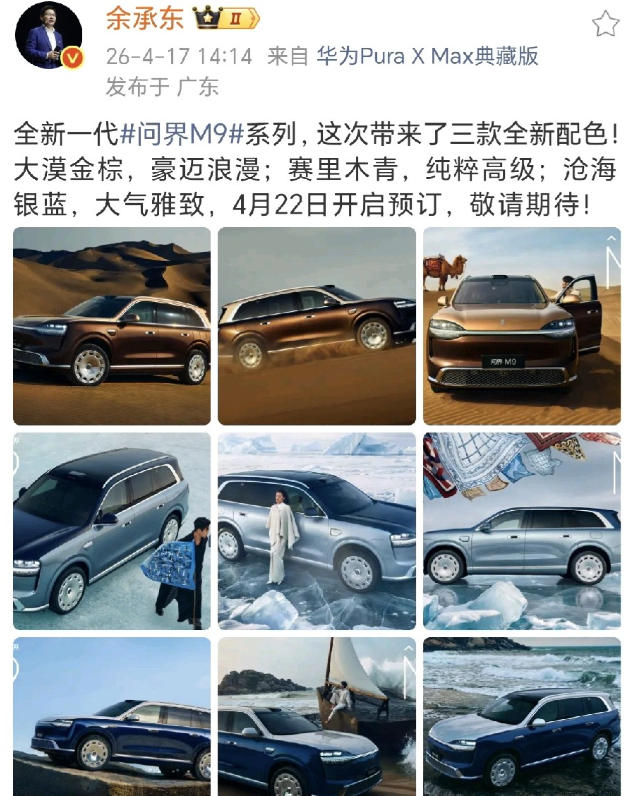 余承东突然曝光全新一代问界M9系列三款全新配色!