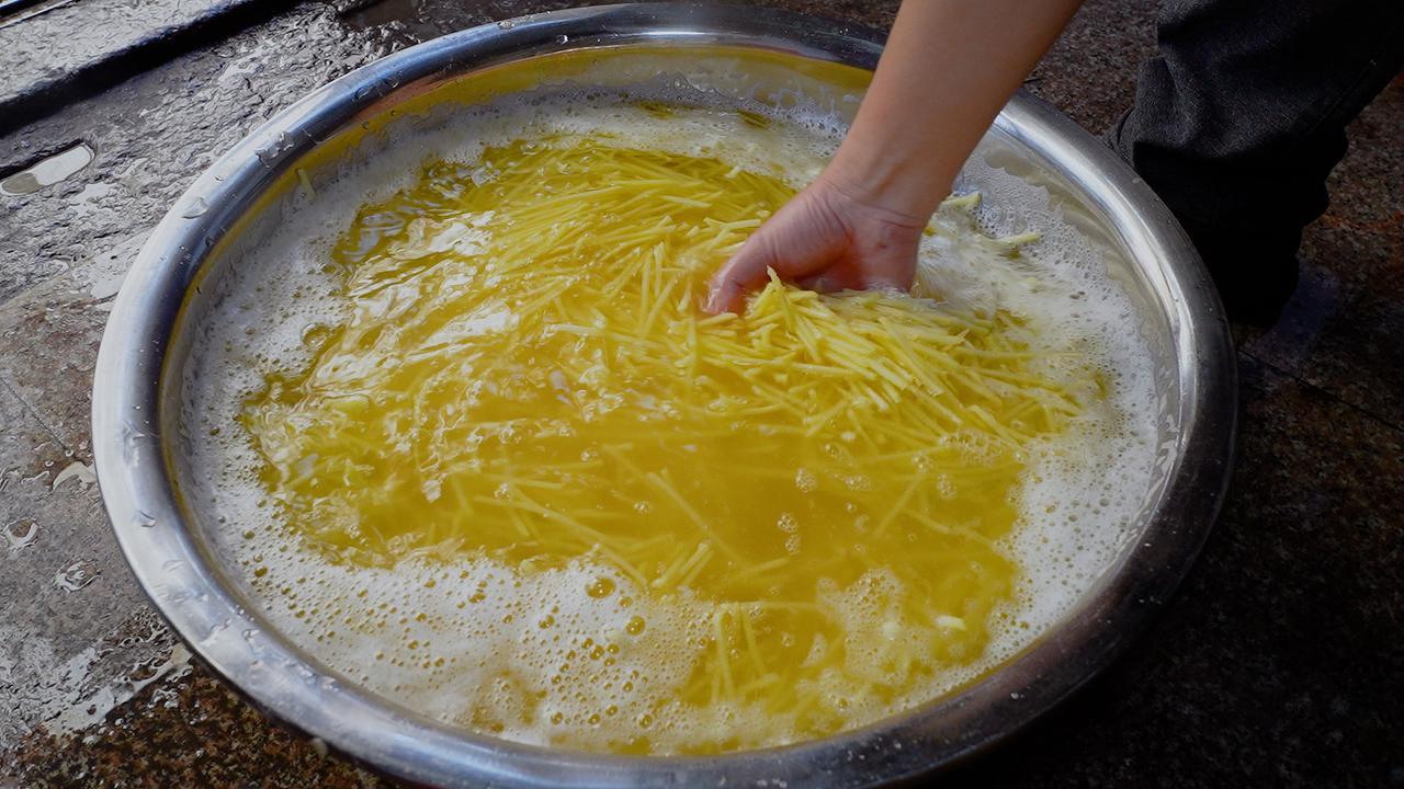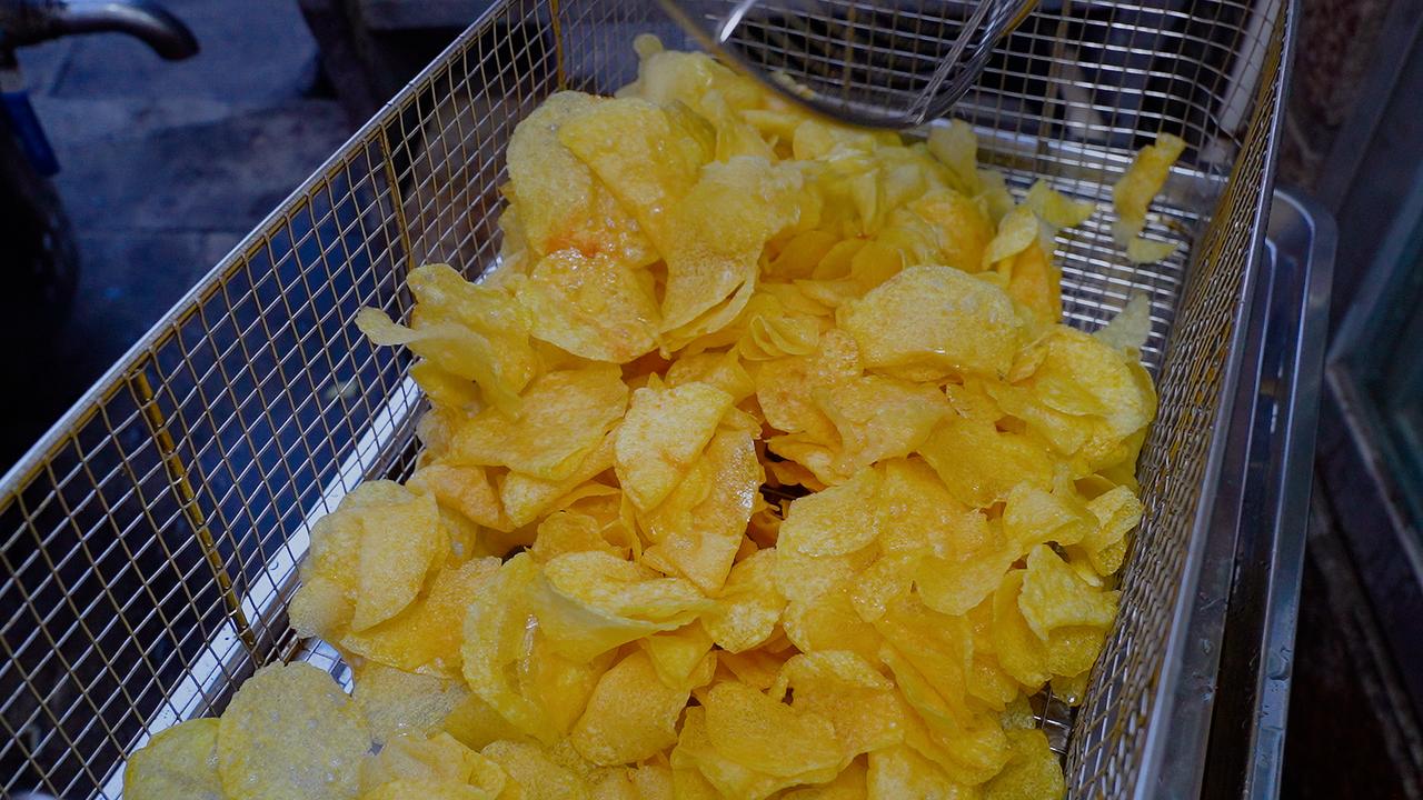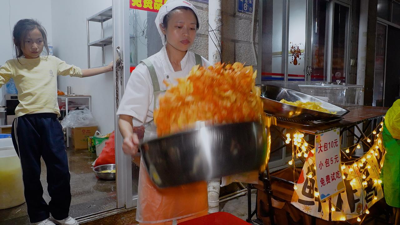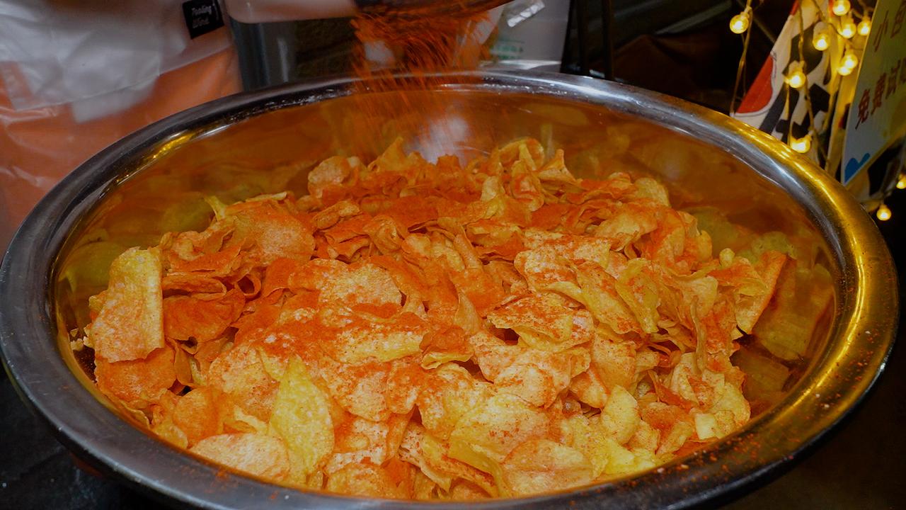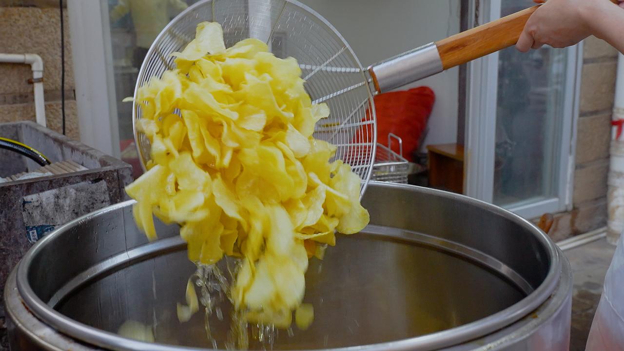 她有洁癖,家人至今不理解跟她为什么跟一堆土豆较劲。6年来她总是独自一人重复着削皮、切片、冲洗。最治愈的,是那些重复了上万次的动作。高峰时一天削500斤土豆,指尖泡得发白,她却从不敷衍。切成薄片,清水洗两遍,滤掉淀粉。油锅沸腾,薯片在热浪中翻滚十几分钟,渐渐镀上金黄。捞出,趁热撒辣椒粉或番茄粉,那股纯粹的洋芋香瞬间炸开,不油腻,不寡淡,脆得刚好。10块满满一大袋,到放学时间就瞬间被学生们包围,六年,她变成了整条街的香气记忆。有人问她值不值得,她只是递过一袋洋芋片,轻声说:“你尝。”
