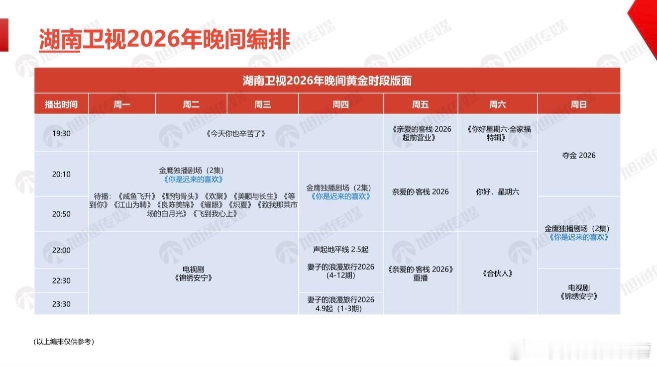网传🥭Q2-Q3 大屏编排网传🥭2026 Q2-Q3 大屏编排- 周四22:00 妻子的浪漫旅行 孙亚婷团队- 5.22起每周五20:00 歌手2026 张丹阳团队- 周五22:00 亲爱的客栈精编版 王鹏飞创新小组- 6月周五22:00即将 中餐厅拾光季 刘力辉团队- 9月周五22:00即将 不想睡的星期五 刘昕团队- 周六20:00 你好星期六 好六超级工作室- 周六22:00 合伙人筹备篇 凌晟团队- 周六22:00即将 合伙人营业篇 凌晟团队- 周六22:00即将 花儿与少年第八季 李超团队- 周日19:30即将 声鸣远扬女团季 任洋团队