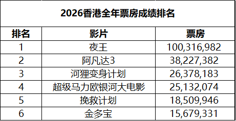 2026年第15周香港票房 :1.《超级马力欧银河大电影》蝉联冠军,累计票房突破2600万;2.《挽救计划》最新票房突破2000万;3.《爱情抓马》在新片中表现最佳;4.《夜王》香港票房破亿,成黄子华第三部香港破亿电影。(数据:香港贸发局)