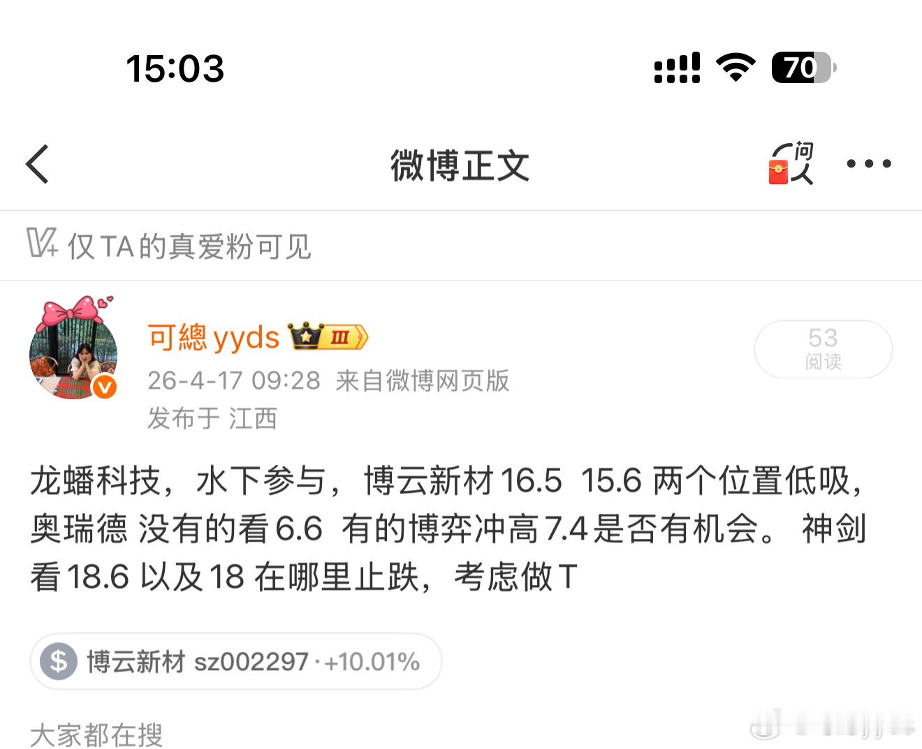 2、博云新材,策略16.5左右低吸,但超人气选手,最低16.74,并且是左右已经持有的打板票,躺赢一板。