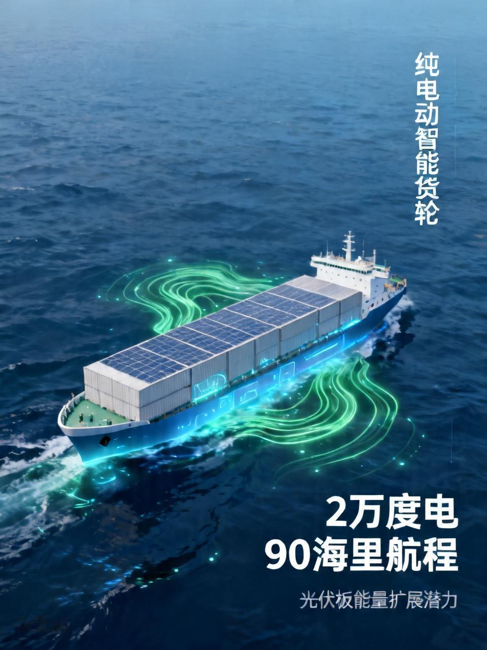 一艘集装箱纯电动智能货轮,拥有2万度电,能行驶90海里的航程距离,显然是我国新能源绿电动能使用在海上轮船上的一种初步的新尝试!假如在轮船上能够利用船旁板及其它可利用的立面与平面等物理空间一切可以充分利用的结构上,装上光伏板或者其它的材料设备后,从而实现电能收集转化为电动能的基础上,这有可能实现在电能的容量和航程上能够数倍乃至数十倍的扩展加量的话,那么在区域内甚至是跨洋的单程货物装载的投送,以实现货物目的地的送达则将是海运远洋作业的革新性里程碑式的现实意义了!