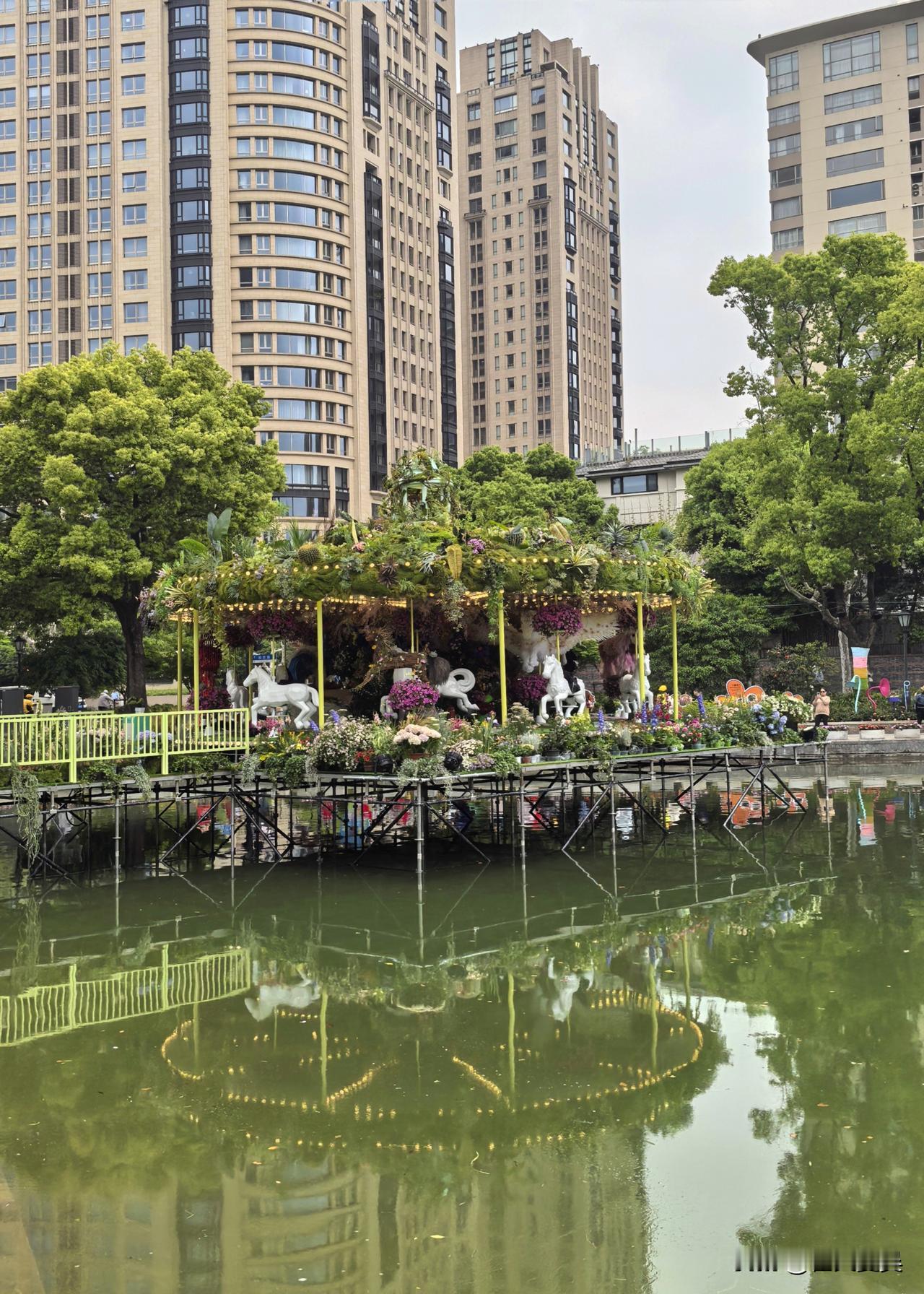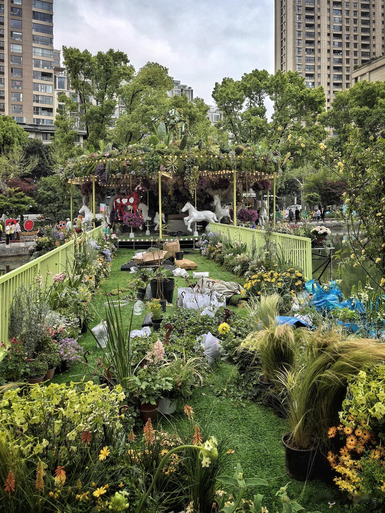 来都来了,还是忍不住拍了几张。虽然还没完全布置好,但已经能想象出明天鲜花盛放木马旋转的梦幻场景了。等正式开幕,这里一定会更惊艳,大家可别错过哦!